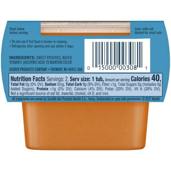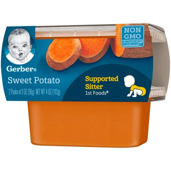 Details Ingredients Sweet Potatoes, Water, Vitamin C (Ascorbic Acid) to Maintain Color. Product features Gerber Baby Food 1st Foods Sweet Potato Non GMO. For supported sitters. Made with sweet potatoes, which are grown using our clean field farming practices. It contains no artificial flavors or colors. This product is not made with genetically engineered ingredients. Gerber® Baby Food 1st Foods Sweet Potato Non GMO. Supported sitter. 2 Packs of 2 oz (56 g). Net Wt 4 oz (113 g). NON-GMO Net Quantity of Content 2.0 X 1 tub