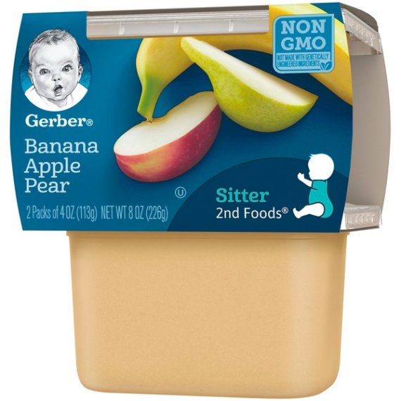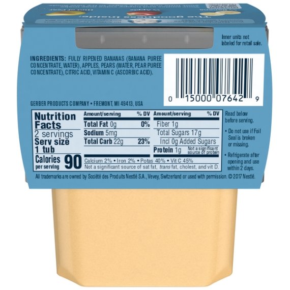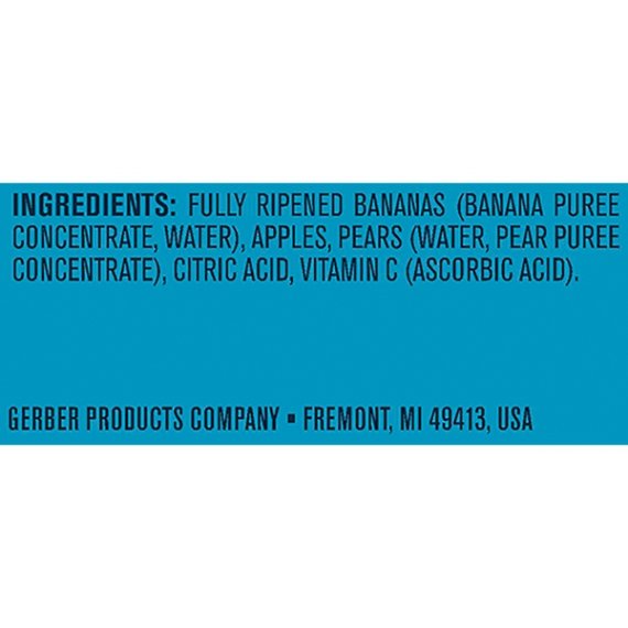 Details Ingredients Fully Ripened Bananas (banana Puree Concentrate, Water), Apples, Pears (water, Pear Puree Concentrate), Citric Acid, Vitamin C (Ascorbic Acid). Show more Product features Continue your baby's love for fruits and vegetables with Gerber 2nd Foods. Gerber 2nd Foods help expose babies to a variety of tastes and ingredient combinations which is important to help them accept new flavors. Gerber 2nd Foods are made with fruits and vegetables that meet Gerber's high quality standards and have the perfect texture for your little one. Gerber 2nd Foods are unsweetened, unsalted, have no added starch and no artificial flavors or colors. Gerber 2nd Foods Banana Apple Pear, 4 Ounce Tubs - Pack of 2 Made with natural fruit - Ingredients carefully selected to meet Gerber high quality standards Unsweetened, unsalted, no added starch, no artificial flavors or colors Age appropriate texture and nutrition that has an excellent source of Vitamin C Gerber is a leader in infant and early childhood nutrition. Have questions? We are awake when you are 24/7: 1-800-284-9488 Special Features Natural Net Quantity of Content 2.0 X 1 Tub