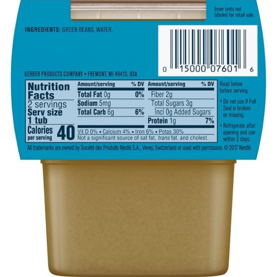 Details Ingredients Green Beans, Water. Product features Continue your baby’s love of veggies with Gerber 2nd Foods Green Bean baby food. Gerber 2nd Foods baby food helps expose babies to a variety of tastes and ingredient combinations which is important to help them accept new flavors. All our recipes are made with fruits and veggies that meet Gerber’s high quality standards. This recipe includes a lot of love, care and 22 green beans in each tub. These green beans were grown using our Clean Field Farming practices. One (1) 2-count pack of 4 oz tubs 2 g fiber per pack Unsalted, no added starch, artificial flavors or colors Non-GMO: not made with genetically engineered ingredients; Packaging made with no BPA Head to MyGerber.com to meet Dotti, your on-call personal baby expert, or call us anytime 24/7 at 1-800-284-9488 Special Features Natural Net Quantity of Content 2.0 X 1 Tub