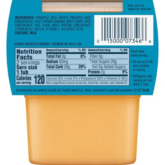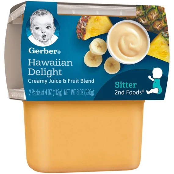 Details Ingredients Pineapple Juice (Water, Pineapple Juice Concentrate), Fully Ripened Bananas, White Grape Juice Concentrate, Rice Flour, Whey Protein Concentrate (from Milk), Water, Vitamin C (Ascorbic Acid). Show more Product features Continue your baby’s love of fruits with Gerber 2nd Foods Hawaiian Delight baby food. Gerber 2nd Foods baby food helps expose babies to a variety of tastes and ingredient combinations which is important to help them accept new flavors. All our recipes are made with fruits and veggies that meet Gerber’s high quality standards. This recipe includes a lot of love, care, 1/8 banana, 1/4 cup fruit juice and 2 tsp cooked rice in each tub. One (1) 2-count pack of 4 oz tubs 45% Daily Value of antioxidant Vitamin C No artificial flavors or colors Packaging made with no BPA Head to MyGerber.com to meet Dotti, your on-call personal baby expert, or call us anytime 24/7 at 1-800-284-9488 Special Features No Net Quantity of Content 2.0 X 1 Tub