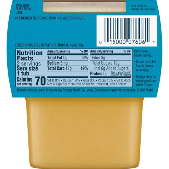 Details Ingredients Pears, Vitamin C. Product features Continue your baby's love for fruits and vegetables with Gerber 2nd Foods. Gerber 2nd Foods help expose babies to a variety of tastes and ingredient combinations which is important to help them accept new flavors. Gerber 2nd Foods are made with fruits and vegetables that meet Gerber's high quality standards and have the perfect texture for your little one. Gerber 2nd Foods are unsweetened, unsalted, have no added starch and no artificial flavors or colors. Gerber 2nd Foods Pears, 4 Ounce Tubs - Pack of 2 Made with natural fruit - Ingredients carefully selected to meet Gerber high quality standards Unsweetened, unsalted, no added starch, no artificial flavors or colors Age appropriate texture and nutrition that has an excellent source of Vitamin C Gerber is a leader in infant and early childhood nutrition. Have questions? We are awake when you are 24/7: 1-800-284-9488 Special Features Natural Net Quantity of Content 2.0 X 1 Tub