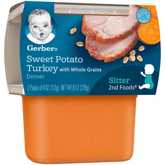 Details Ingredients Sweet Potatoes, Water, Ground Turkey, Whole Grain Oat Flour (Contains Wheat), Brown Rice Flour, Canola Oil, Ascorbic Acid. Product features Our Gerber 2nd Foods Nutritious Dinners Sweet Potato & Turkey with Whole Grains baby food helps expose babies to a variety of tastes and ingredient combinations which is important to help them accept new flavors. This recipe includes a lot of love, care, 1/4 cup sweet potato, 1 1/2 tsp turkey, and 2 1/2 Tbsp mixed grains. One (1) 2-count pack of 4 oz tubs 2g of protein One full serving of veggies Unsweetened, no artificial flavors or colors. Package not made with BPA. Gerber is a leader in infant and early childhood nutrition. Have questions? We are awake when you are 24/7: 1-800-284-9488 Special Features Yes Net Quantity of Content 2 X 1 Pack