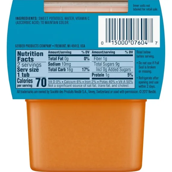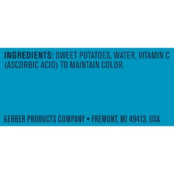 Details Ingredients Sweet Potatoes, Water, Vitamin C. Product features Continue your babyâs love of veggies with Gerber 2nd Foods Sweet Potato baby food. Gerber 2nd Foods baby food helps expose babies to a variety of tastes and ingredient combinations which is important to help them accept new flavors. All our recipes are made with fruits and veggies that meet Gerberâs high quality standards. This recipe includes a lot of care, love and 2/3 sweet potato in each tub. These sweet potatoes were grown using our Clean Field Farming practices. One (1) 2-count pack of 4 oz tubs 50% Daily Value of antioxidant Vitamin A Unsweetened, unsalted, no added starch, artificial flavors or colors Non-GMO: not made with genetically engineered ingredients; Packaging made with no BPA Head to MyGerber.com to meet Dotti, your on-call personal baby expert, or call us anytime 24/7 at 1-800-284-9488 Special Features No Net Quantity of Content 2.0 X 1 Tub
