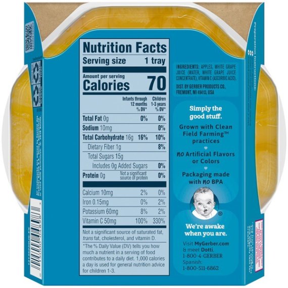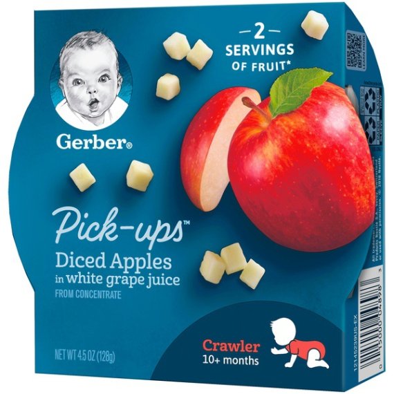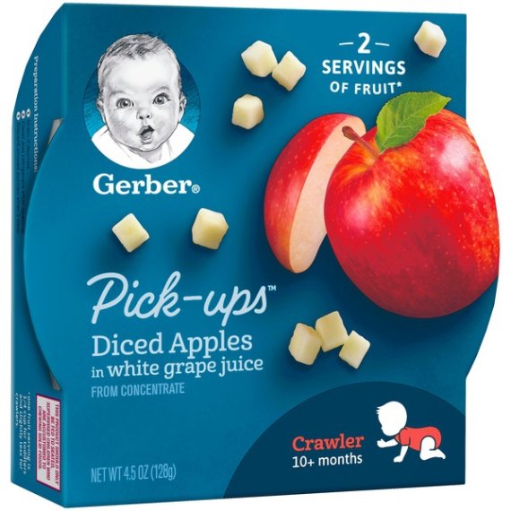 Details Ingredients Apples, White Grape Juice (Water, White Grape Juice Concentrate), Vitamin C (Ascorbic Acid). Product features For a convenient way to serve your little one fruit, try Gerber Fruit Pick-Ups Diced Apples! We make just the right sized pieces that are easy to hold, chew and swallow. Our fruit dices also complement any of your little one's meals and make a healthy snack. One (1) 4.5 oz tray Tray not made with BPA Contains no artificial colors or flavors Offers 2 servings of fruit Head to MyGerber.com to meet Dotti, your on-call personal baby expert, or call us anytime 24/7 at 1-800-284-9488 Special Features Yes Net Quantity of Content 1.0 X 1 Tray Infants through 12 months