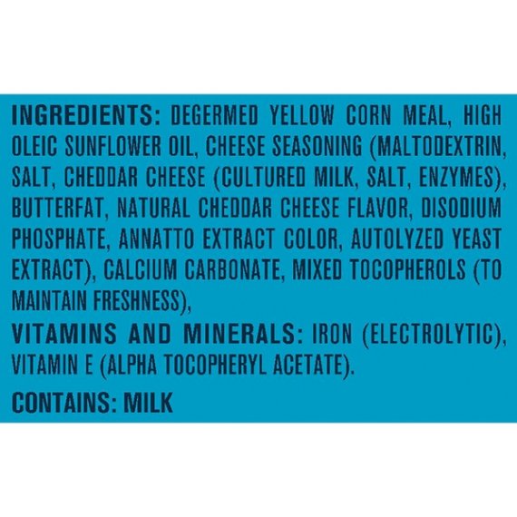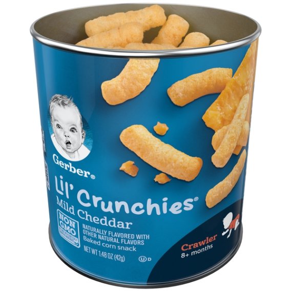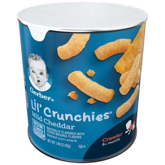 Details Ingredients Degermed Yellow Corn Meal, High Oleic Sunflower Oil, Cheese Seasoning (Maltodextrin, Salt, Cheddar Cheese (Cultured Milk, Salt, Enzymes), Butterfat, Natural Cheddar Cheese Flavor, Disodium Phosphate, Annatto Extract Color, Autolyzed Yeast Extract), Calcium Carbonate, Mixed Tocopherols (to Maintain Freshness), Vitamins and Minerals: Iron (Electrolytic), Vitamin E (Alpha Tocopheryl Acetate). Show more Product features Make every little bite count with Gerber Lil' Crunchies Baked Corn Snack. Each serving is made with 2g of whole grain goodness and never any artifical flavors, artificial colors and NO GMOS. Gerber Lil Crunchies has the ideal texture that is easy to chew and swallow and is sized just right for older babies learning to pick up. One (1) 1.48 oz container Baked with care and 2 grams of whole grains per serving No Artificial Flavors or Artifical Colors Non-GMO: not made with genetically engineered ingredients Head to MyGerber.com to meet Dotti, your on-call personal baby expert, or call us anytime 24/7 at 1-800-284-9490 Special Features No Net Quantity of Content 6.0 X Infants Through 12 Months 16 Pieces (7g)