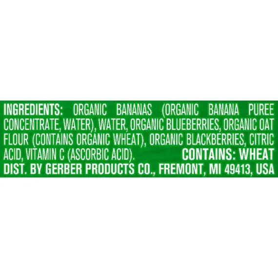 Details Ingredients Organic Bananas (Organic Banana Puree Concentrate, Water), Water, Organic Blueberries, Organic Oat Flour (Contains Organic Wheat), Organic Blackberries, Citric Acid, Vitamin C (Ascorbic Acid). Show more Product features A Clear choice for baby, now in a transparent pouch. Our Gerber Organic 2nd Foods Banana Blueberry Blackberry Oatmeal baby food lives up to over 100 Gerber quality checks. Now features our proprietary Smart Flow spout: flow control means more on your little one's spoon, not everywhere else. One (1) 3.5 oz pouch Made with 2/5 banana, 6 blueberries, 1 blackberry, 1/2 tbsp. oats No artificial flavors or colors, no added starch, unsalted USDA Certified Organic, Non-GMO Project Verified and package not made with BPA Head to MyGerber.com to meet Dotti, your on-call personal baby expert, or call us anytime 24/7 at 1-800-284-9488 Special Features Yes Net Quantity of Content 1 X 1 pouch