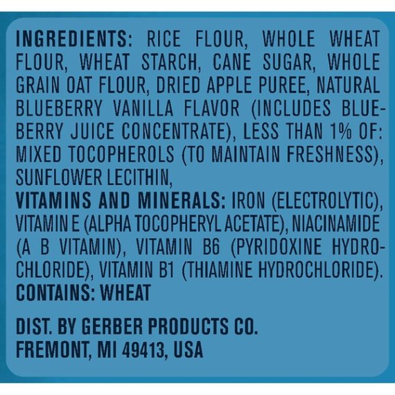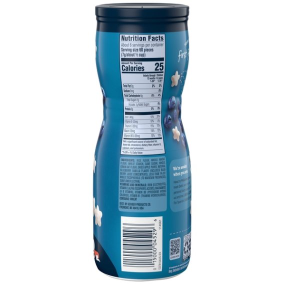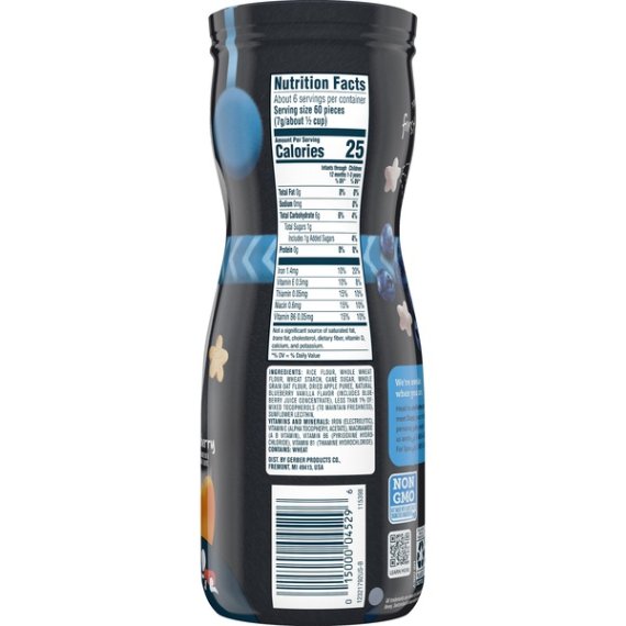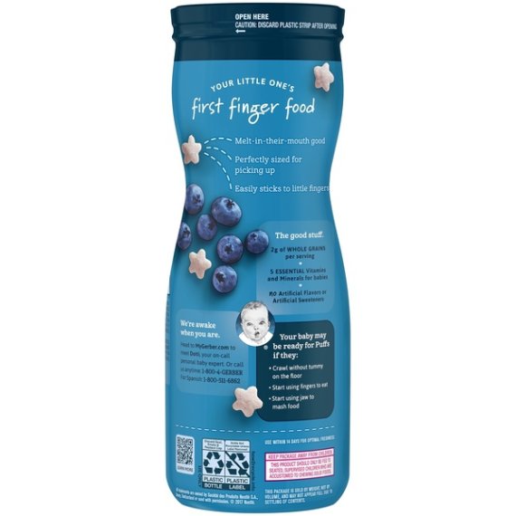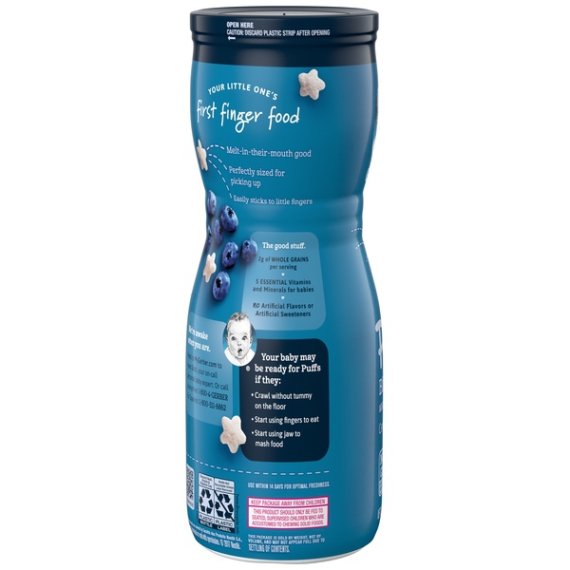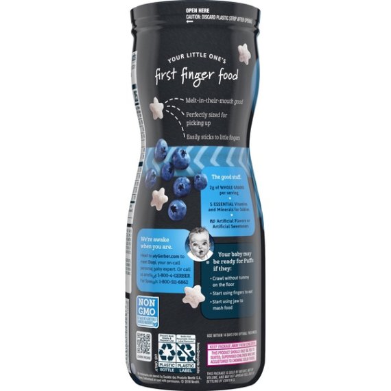 Details Ingredients Rice Flour, Whole Wheat Flour, Wheat Starch, Cane Sugar, Whole Grain Oat Flour, Dried Apple Puree, Natural Blueberry Vanilla Flavor (Includes Blueberry Juice Concentrate), Less Than 1% of: Mixed Tocopherols (to Maintain Freshness), Sunflower Lecithin, Vitamins and Minerals: Iron (Electrolytic), Vitamin E (Alpha Tocopheryl Acetate), Niacinamide (a B Vitamin), Vitamin B6 (Pyridoxine Hydrochloride), Vitamin B1 (Thiamin Hydrochloride). Show more Product features Nourish your little one with whole grain goodness by serving Gerber Puffs Cereal Snack at snack time. Gerber Puffs Cereal Snack have 2 grams of whole grains per serving, and 5 vitamins and minerals making them an ideal snack for your older baby learning to self feed. Gerber Puffs Cereal Snack are easy to chew and swallow and are just the right size for little hands to pick up and enjoy. One (1) 1.48 oz container of Gerber Blueberry Puffs Melt-in-your-mouth texture specially designed to dissolve quickly Star-shaped with ridges, making them easy for little ones to pick up Non-GMO: Not made with genetically engineered ingredients Gerber is a leader in infant and early childhood nutrition. Have questions? We are awake when you are 24/7: 1-800-284-9488 Special Features No Net Quantity of Content 6.0 X 60 Pieces (7g/About 1/2 Cup) Infants through 12 months