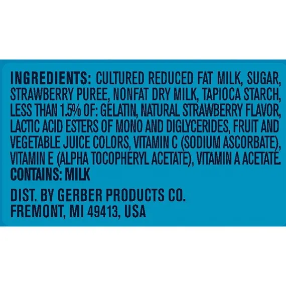 Details Ingredients Cultured Reduced Fat Milk, Sugar, Strawberry Puree, Nonfat Dry Milk, Tapioca Starch, less than 1.5% of: Gelatin, Natural Strawberry Flavor, Lactic Acid Esters of Mono and Diglycerides, Fruit and Vegetable Juice Colors, Vitamin C (Sodium Ascorbate), Vitamin E (Alpha Tocopheryl Acetate), Vitamin A Acetate. Show more Product features Nourish your little one with the goodness of Gerber Strawberry Yogurt Melts Freeze-Dried Yogurt & Fruit Snacks. These tasty snacks are made with real yogurt and fruit. With live and active cultures and a good source of Vitamins A, C, and E, these snacks combine the delicious taste little ones love with the wholesome nutrition parents love. 1 oz package No artificial flavors or sweeteners No preservatives Each bite melts in your little one's mouth and is easy to chew and swallow Gerber is a leader in infant and early childhood nutrition. Have questions? We are awake when you are 24/7: 1-800-284-9488 Special Features No Net Quantity of Content 4.0 X ¼ Cup (7g) Infants through 12 months % DV