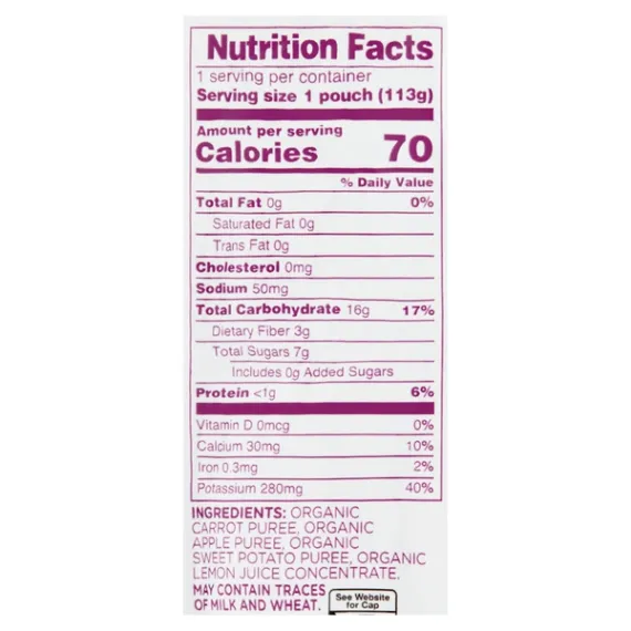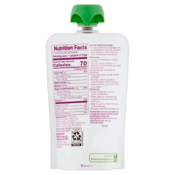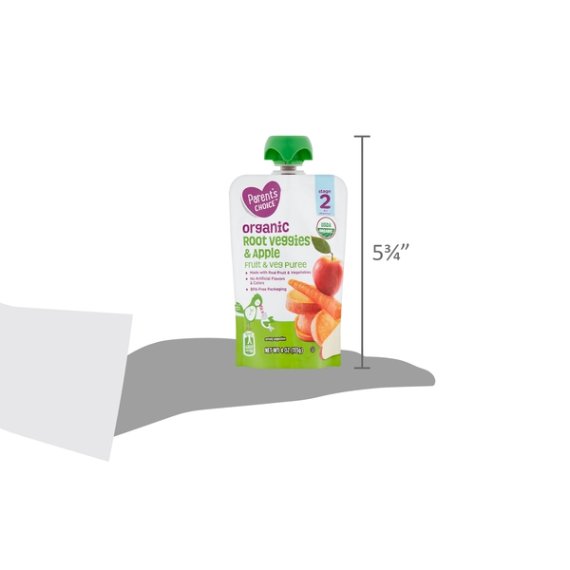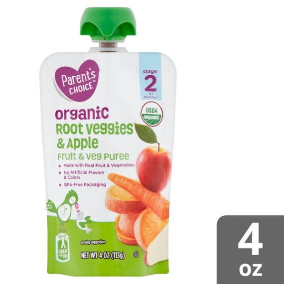 Details Ingredients Organic Carrot Puree, Organic Apple Puree, Organic Sweet Potato Puree, Organic Lemon Juice Concentrate Product features Stage 2 6+ months* *This age is provided as guidance only. As your infant grows into a toddler, feed him or her in an easy, healthy way with Parent's Choice Organic Root Veggies & Apple Fruit & Veg Puree, Stage 2, 6+ Months. This fruit and vegetable puree is ready to eat right from a convenient, squeezable package. The organic mix of carrot, apple, and sweet potato puree combined with lemon juice provides essential nutrition that travels well for a great snack on the go. This snack has no artificial colors or flavors added, and comes in a BPA-free pouch. The puree offers iron, calcium, and potassium, as well as 3 grams of dietary fiber per pouch to help with your child's digestion. Have a healthy, tasty snack on hand for your infant any time you need it with Parent's Choice Organic Root Veggies & Apple Fruit & Veg Puree, Stage 2, 6+ Months. Parent's Choice provides parents with baby and toddler products you need at a price that won't push your budget over the edge. We offer everything you need from bath time to bed time and every time in between, all with the high quality we know your little one needs. Parent's Choice is conveniently available online and in Walmart stores nationwide, allowing you to stock up, save money and live better. 4oz of puree per package Contains carrot, apple, and sweet potato puree Iron, calcium, and potassium included 3g dietary fiber per serving Refrigerate after opening and finish within 24 hours Special Features 3g dietary fiber per serving Net Quantity of Content 1 X 1 pouch (113g)