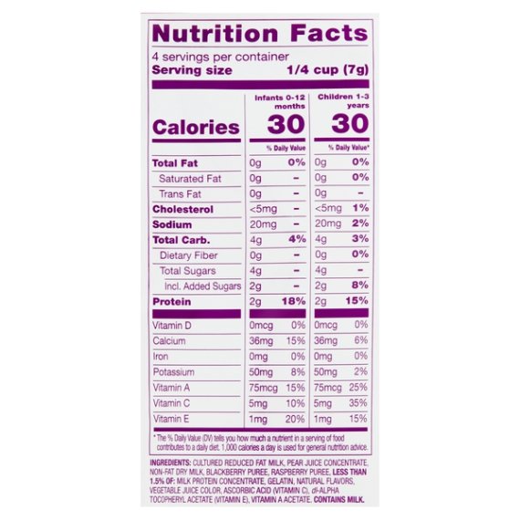 Details Ingredients Cultured Reduced Fat Milk, Pear Juice Concentrate, Non-Fat Dry Milk, Blackberry Puree, Raspberry Puree, Less than 1.5% of: Milk Protein Concentrate, Gelatin, Natural Flavors, Vegetable Juice Color, Ascorbic Acid (Vitamin C), dl-Alpha Tocopheryl Acetate (Vitamin E), Vitamin A Acetate Show more Product features Freeze-Dried Yogurt & Fruit SnacksStage 3 9+ monthsâ â The age is provided for guidance only.Your child may be ready to use this product if she or he:⢠Crawls with stomach off the floor⢠Begins to self-feed with fingers⢠Begins to use jaw to mash foodWatch your child smile with delight at the deliciously sweet flavor of Parent's Choice Mixed Berry Yogurt Bites, Stage 3, 9+ Months. These delicious yogurt bites are made with real yogurt and fruit including blackberries, strawberries, and raspberries. Our yogurt bites provide an excellent source of calcium, vitamin A, vitamin C, and vitamin E, making them nutritious as well as a tasty morsel. They even contain live, active cultures that promote digestive health. Made with no preservatives, artificial flavors, or artificial sweeteners, it's the perfect snack for your child over 9 months of age. Pack this 1-ounce pouch into your baby bag or stroller on your next family excursion so your little one always has a scrumptious treat. Your child will love the creamy yogurt flavor and sweet berry taste of Parent's Choice Mixed Berry Yogurt Bites, Stage 3, 9+ Months.Try our other delicious flavors:⢠Banana⢠Cherry vanilla⢠Strawberry⢠PeachParent's Choice provides parents with baby and toddlerâ¯productsâ¯you need at a price that won't push your budget over the edge. We offer everything you need from bath time to bed time and every time in between, allâ¯withâ¯the high quality we know your little one needs. Parent's Choice is conveniently available online and in Walmart stores nationwide, allowing you to stock up, save money and live better. Mixed berry freeze-dried yogurt and fruit snacks Naturally flavored real yogurt, fruit, and fruit juice No preservatives, artificial flavors, or artificial sweeteners Live, active cultures 1oz pouch Special Features 1oz pouch Net Quantity of Content 4 X 1/4 cup (7g) Infants 0-12 months