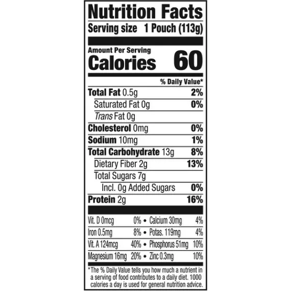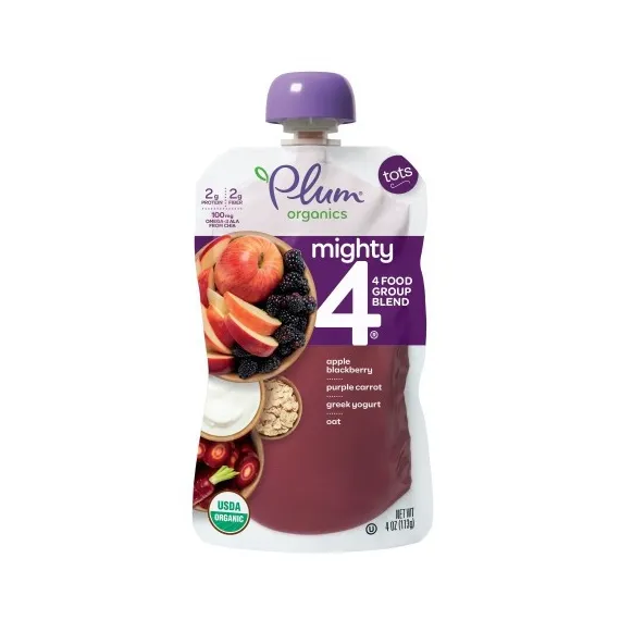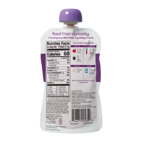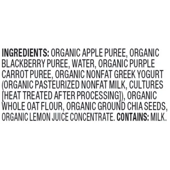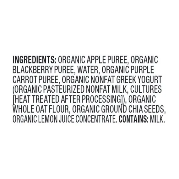 Details Ingredients Ingredients: Organic Apple Puree, Organic Blackberry Puree, Water, Organic Purple Carrot Puree, Organic Nonfat Greek Yogurt (Organic Pasteurized Nonfat Milk, Cultures [Heat Treated After Processing]), Organic Whole Oat Flour, Organic Ground Chia Seeds, Organic Lemon Juice Concentrate. Contains: Milk. Show more Product features Mighty 4 pouches, a puree of organic fruits, veggies, protein and grains, are the perfect snack for toddlers. Every pouch is filled with essential nutrients from 4 food group favorites to fuel your active tot. And with amazing flavor combos squeezed into one pouch, we make it easy for your mighty one to enjoy on-the-go goodness anytime. 4 food groups in every pouch. Whole grains, fruits, veggies and dairy 2g protein 2g fiber 100mg omega-3 ALA from chia Certified Organic Special Features No Net Quantity of Content 1.0 X 1 POUCH (113 G)