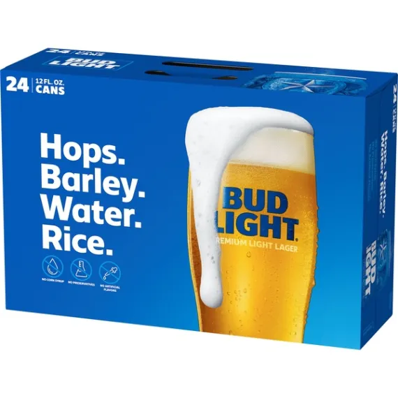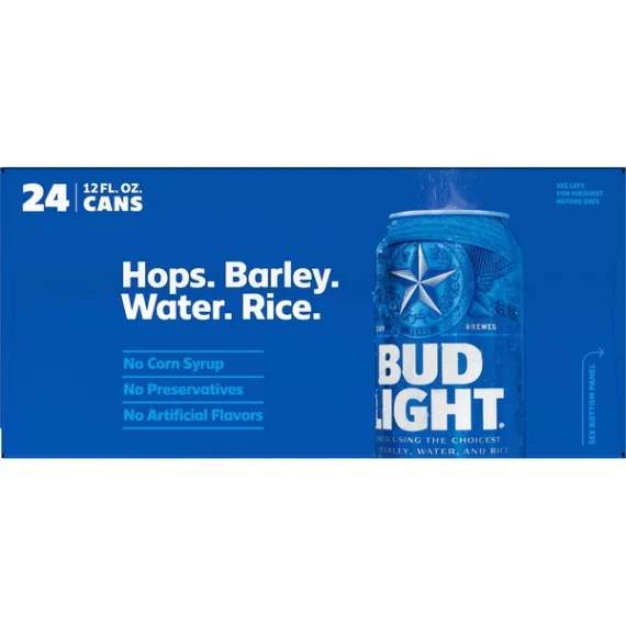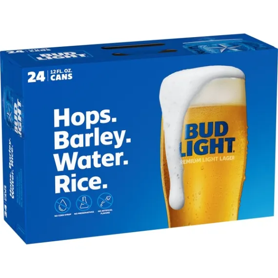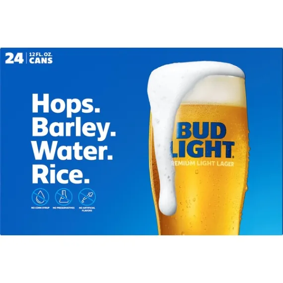 Details Ingredients Hops, barley, water, rice. Product features Bud Light is a premium light lager with a superior drinkability that has made it the best-selling and most popular beer in the United States. Bud Light is brewed using a blend of premium aroma hop varieties, both American-grown and imported, and a combination of barley malts and rice. Bud Light is a light-bodied beer featuring a fresh, clean taste with a subtle hop aroma, delicate malt sweetness and a crisp finish that delivers the ultimate refreshment. Light-bodied beer featuring a fresh, clean taste with a subtle hop aroma, delicate malt sweetness and a crisp finish that delivers the ultimate refreshment. Bud Light is brewed in the USA. Bud Light is the beer you can always count on. We use four essential ingredients in every batch of Bud Light: barley, rice, water, and hops. Bud Light contains 110 calories per 12 (fl. oz.), 0 g. fat (per 12 fl. oz.), and 6.6 g carbs (per 12 fl. oz.) to make it America's favorite light lager. 4.2% ABV Our brewmasters hand-select the hops going into Bud Light, adding the right amount of floral notes and bitterness. Special Features Bud light