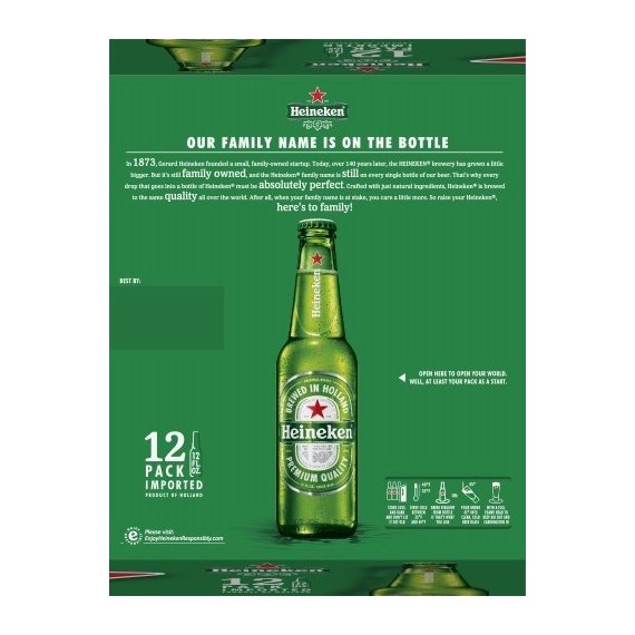 Details Ingredients Water, Malted Barley, Hops. Product features Heineken Lager Beer (12 Pack 12 fl oz bottles) complements any food. Brewed using an original recipe with a passion for quality in Holland, it's full-bodied with a deep golden color. The Heineken premium beer has a mild bitter taste and a balanced hop aroma with a crisp, clean and refreshing finish. Heineken Lager Beer: Original recipe Brewed with a passion for quality in Holland 12 count pack of 12 fl oz bottles Imported premium lager beer Ext. 1873 Full-bodied with deep golden color Mild bitter taste and a balanced hop aroma Crisp, clean and refreshing finish Contains just 3 natural ingredients: water, malted barley and hop extracts Complements all types of foods Special Features Imported. Premium. Original recipe. Premium quality. Brewed with passion for quality. Brewed in Holland. Legendary travelers wanted. Please visit: Enjoy HeinekenResponsibly.com. Please recycle. Brewed and bottled by Heineken Brouweijen BV, Amsterdam, Holland. Product of Holland.