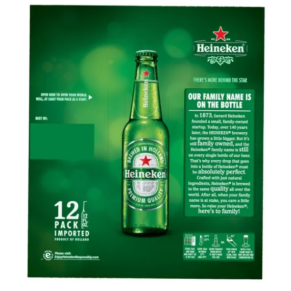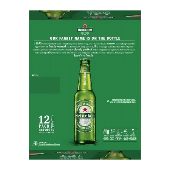 Details Ingredients Water, Malted Barley, Hops. Product features Heineken Lager Beer (12 Pack 12 fl oz bottles) complements any food. Brewed using an original recipe with a passion for quality in Holland, it's full-bodied with a deep golden color. The Heineken premium beer has a mild bitter taste and a balanced hop aroma with a crisp, clean and refreshing finish. Heineken Lager Beer: Original recipe Brewed with a passion for quality in Holland 12 count pack of 12 fl oz bottles Imported premium lager beer Ext. 1873 Full-bodied with deep golden color Mild bitter taste and a balanced hop aroma Crisp, clean and refreshing finish Contains just 3 natural ingredients: water, malted barley and hop extracts Complements all types of foods Special Features Imported. Premium. Original recipe. Premium quality. Brewed with passion for quality. Brewed in Holland. Legendary travelers wanted. Please visit: Enjoy HeinekenResponsibly.com. Please recycle. Brewed and bottled by Heineken Brouweijen BV, Amsterdam, Holland. Product of Holland.
