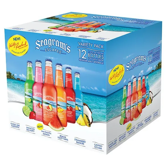 Details Product features Unwind and have fun with Seagram's Escapes Variety Pack Bottles. This box contains six different people-pleasing flavors, including Peach Fuzzy Navel, Jamaican Me Happy and Strawberry Daquiri. Each version features iconic tropical tastes to leave you feeling transported to that sunny island beach, even if you're stuck at home. Now you can try all the delicious, thirst-quenching options. This Seagram's Escapes 12-pack is a convenient stock-up solution for a festive refrigerator. Please drink responsibly. Seagram's Escapes Variety Pack 12-11.2 fl. oz. Bottles: Featuring 6 flavors: Wild Berries, Calypso Colada, Jamaican Me Happy, Strawberry Daiquiri, Peach Fuzzy Navel and Black Cherry Fizz Malt beverage 3.2% ABV Package contains twelve 11.6-fl-oz Seagram's wine coolers