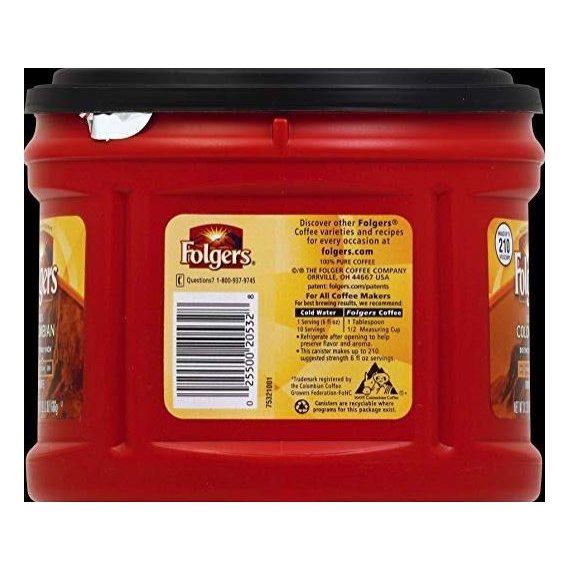 Details Ingredients Coffee. Product features Folgers 100% Colombian coffee bursts with a distinctively full-bodied taste of 100% Colombian beans that will have you looking forward to it every morning. Bold coffee that is distinctively rich and uniquely flavorful. Founded in San Francisco, Folgers is an iconic American brand with a history as rich as its coffee. For more than 150 years, Folgers has been the “Best Part of Wakin' Up" with its Mountain Grown beans and fresh, eye-opening aroma. Folgers coffee provides you with consistently rich, pure taste, cup after cup. Our great taste is equally matched by the dedication to bringing you the flavors you love in the format you choose. Some of your favorite Folgers roasts are also available in canisters, K-Cup Pods, instant, individual single serve packets and other convenient formats. The world's richest and most aromatic medium-dark roast finely ground coffee made with Mountain Grown beans 100% pure coffee. Roasted in New Orleans, Louisiana Interlocking AromaSeal canister seals tight to lock in freshness Special Features Makes up to 210 6 fl oz cups. Mountain grown. Distinctively rich. Questions? 1-800-937-9745. Discover other Folgers coffee varieties and recipes for every occasion at folgers.com. 100% pure coffee. For all coffee makers. 100% Colombian coffee (Trademark registered by the Colombian Coffee Growers Federation-FoNC). Canisters are recyclable where programs for this package exist.