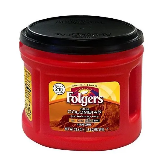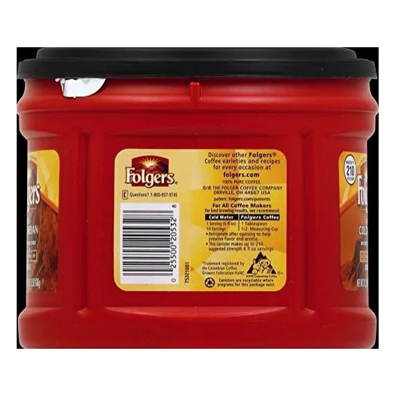 Details Ingredients Coffee. Product features Folgers 100% Colombian coffee bursts with a distinctively full-bodied taste of 100% Colombian beans that will have you looking forward to it every morning. Bold coffee that is distinctively rich and uniquely flavorful. Founded in San Francisco, Folgers is an iconic American brand with a history as rich as its coffee. For more than 150 years, Folgers has been the “Best Part of Wakin' Up" with its Mountain Grown beans and fresh, eye-opening aroma. Folgers coffee provides you with consistently rich, pure taste, cup after cup. Our great taste is equally matched by the dedication to bringing you the flavors you love in the format you choose. Some of your favorite Folgers roasts are also available in canisters, K-Cup Pods, instant, individual single serve packets and other convenient formats. The world's richest and most aromatic medium-dark roast finely ground coffee made with Mountain Grown beans 100% pure coffee. Roasted in New Orleans, Louisiana Interlocking AromaSeal canister seals tight to lock in freshness Special Features Makes up to 210 6 fl oz cups. Mountain grown. Distinctively rich. Questions? 1-800-937-9745. Discover other Folgers coffee varieties and recipes for every occasion at folgers.com. 100% pure coffee. For all coffee makers. 100% Colombian coffee (Trademark registered by the Colombian Coffee Growers Federation-FoNC). Canisters are recyclable where programs for this package exist.