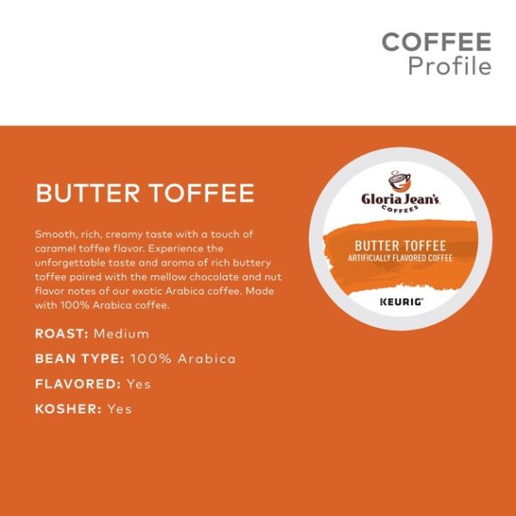 Details Ingredients 100% Arabica Coffee. Product features Gloria Jean’s Coffees is continually introducing taste-tempting hot beverages and refreshing chillers. Gloria jean’s coffees’ passion for quality has made us a leader in gourmet flavored coffees, varietals and blends. At Gloria Jean’s Coffees, coffee is our passion. We painstakingly select our Arabica beans from only the most discriminating sources, with whom we share a commitment to bring you the highest quality coffee in the world. From bean to cup, nothing is compromised, making Gloria Jean’s coffee the very finest you can buy. Gloria Jean's Butter Toffee flavored coffee has a smooth, creamy taste, with a touch of caramel toffee. Flavor your day with all our K-Cup Pod varieties. Compatible with all Keurig Single Serve K-Cup Pod Coffee Makers. Smooth, creamy with a touch of caramel toffee flavor Medium body, medium acidity and a smooth finish Medium Roast, caffeinated coffee Orthodox Union Kosher Compatible with Keurig® K-Cup® pod single-serve coffee makers Special Features Made with recycled materials