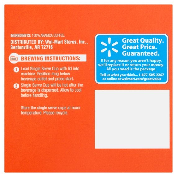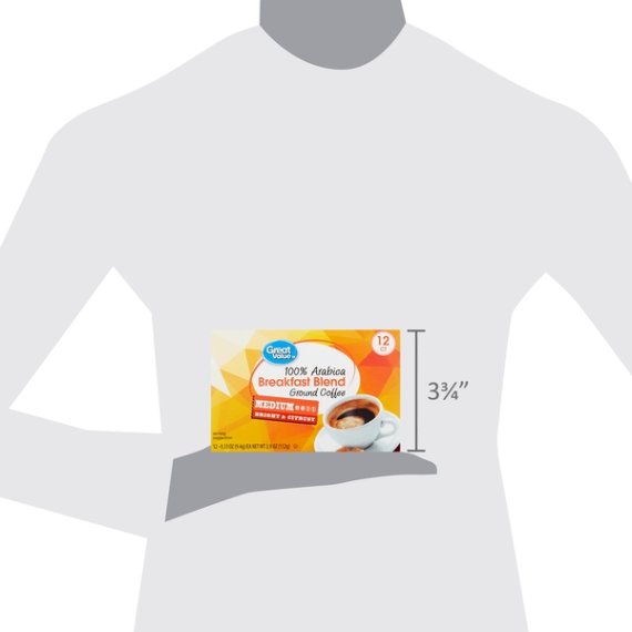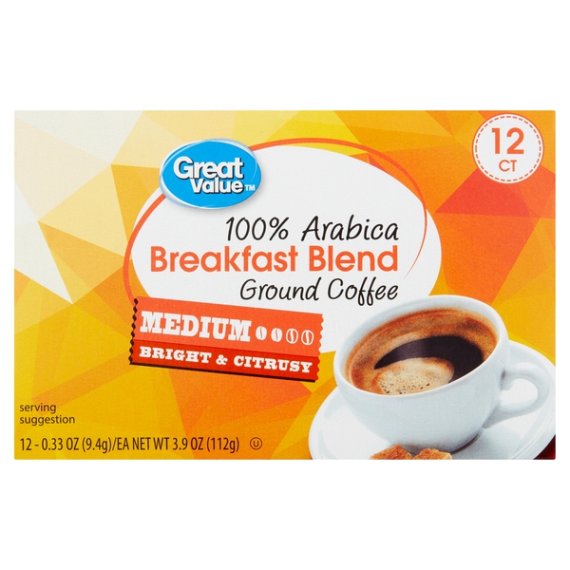 Details Ingredients 100% ARABICA COFFEE. Product features Start your day off the right way with a fresh, steaming cup of Great Value 100% Arabica Breakfast Blend Medium Ground Coffee. This convenient package includes 12 single-serve cups that are compatible with any pod brewing system on the market. The medium roast Breakfast Blend features a bright citrus flavor that your friends, family, and coworkers will adore. There's no faster or easier way to make a steaming hot cup of delicious coffee in your kitchen at home. A perfect complement to breakfast with the family or brunch with friends, these single serve cups will earn a permanent place in your pantry. With Great Value 100% Arabica Breakfast Blend Medium Ground Coffee cups, you'll have more time and energy to spend on the things in life that matter most. Great Value products provide families with affordable, high quality grocery and household consumable options. With our wide range of product categories spanning grocery and household consumables, we offer you a variety of products for your family's needs. Our products are conveniently available online and in Walmart stores nationwide, allowing you to stock up and save money at the same time. Great Value 100% Arabica Breakfast Blend Coffee Pods, Medium Roast, 12 Count: 100% Arabica Breakfast Blend Ground Coffee Medium roast with bright citrus flavor 12 single serve cups Compatible with pod brewing systems