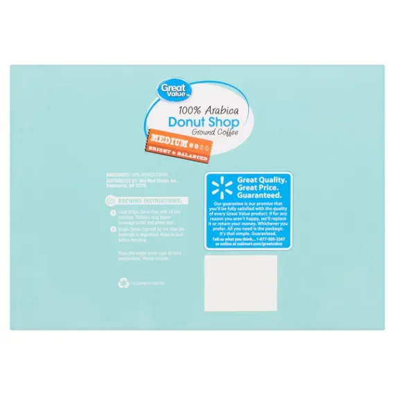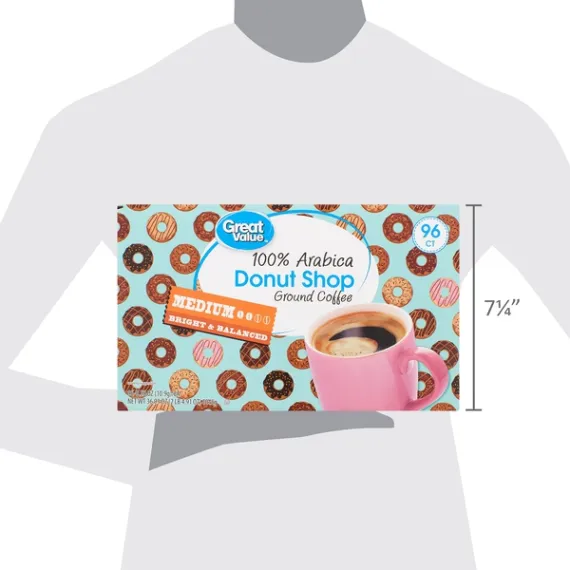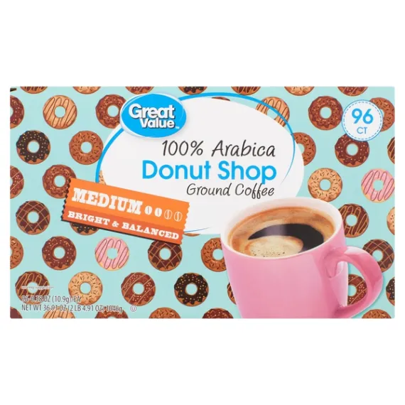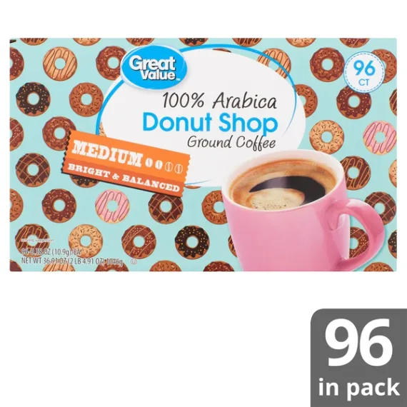 Details Ingredients 100% ARABICA COFFEE. Product features Start your day off the right way with a fresh, steaming cup of Great Value Donut Shop 100% Arabica Medium Ground Coffee. This convenient package includes 96 single-serve cups that are compatible with most pod brewing system on the market. The medium roast Donut Shop blend features a bright and balanced flavor that will remind you of your favorite breakfast pastry or baked good. There's no easier or quicker way to make a steaming hot cup of delicious coffee at home. The perfect accompaniment to breakfast with the family or brunch with friends, these single-serve cups will earn a permanent place in your pantry. With Great Value Donut Shop 100% Arabica Medium Ground Coffee cups, you'll have more time and energy to spend on the things in life that matter most. Great Value products provide families with affordable, high quality grocery and household consumable options. With our wide range of product categories spanning grocery and household consumables, we offer you a variety of products for your family's needs. Our products are conveniently available online and in Walmart stores nationwide, allowing you to stock up and save money at the same time. Great Value 100% Arabica Donut Shop Coffee Pods, Medium Roast, 96 Count: 100% Arabica ground coffee 96 single-serve cups Medium roast Bright and balanced flavor Quick to brew Compatible with major pod brewing systems