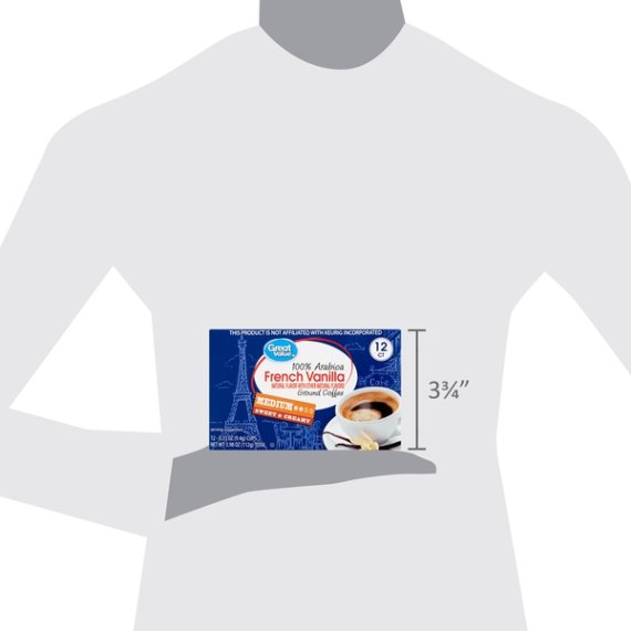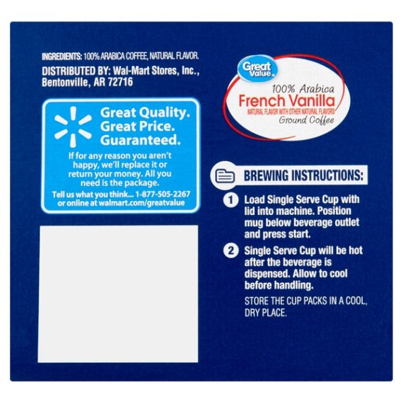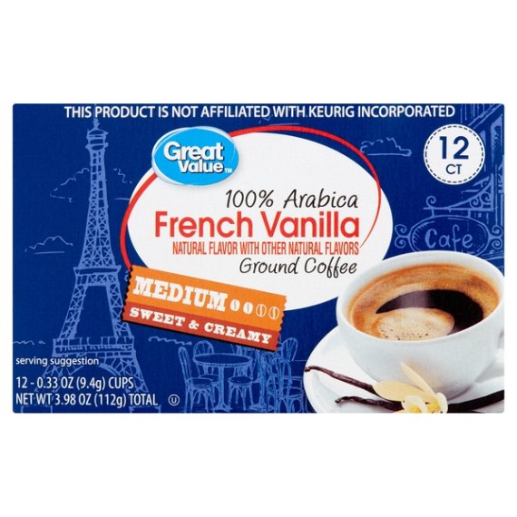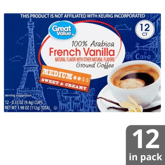 Details Ingredients 100% ARABICA COFFEE, NATURAL FLAVOR Product features Great Value French Vanilla Medium Ground Coffee is a robust blend that combines the uplifting aroma of vanilla with the classic taste of freshly ground coffee. Great Value French Vanilla Flavored comes in 12 CT single serve coffee pods that are a convenient way to enjoy a quick cup of coffee any time of day. Great Value French Vanilla offers you a rich coffee experience and fills the room with the aroma of freshly-baked sugar cookies. Made with 100% Arabica coffee, this premium blend is medium roasted and perfectly balanced with a smooth finish. This 3.98oz. box contains 12 single serve pods. Compatible with all major brewing systems, these single serve cups deliver well-balanced notes of vanilla and butterscotch. Drink it hot while appreciating the rich aroma or add ice to create a refreshing drink. This rich, creamy vanilla flavored blend will surely become your favorite and will leave you asking for more. Like a dream in a cup, Great Value French Vanilla Medium Ground Coffee's fragrant and full vanilla flavor and medium roast make it an alluring treat from dawn to dusk. Great Value products provide families with affordable, high quality grocery and household consumable options. With our wide range of product categories spanning grocery and household consumables, we offer you a variety of products for your family's needs. Our products are conveniently available online and in Walmart stores nationwide, allowing you to stock up and save money at the same time. Great Value 100% Arabica French Vanilla Coffee Pods, Medium Roast, 12 Count: Smooth and aromatic 100% Arabica coffee Compatible with major brewing systems 12 single-serve cups Ready to use