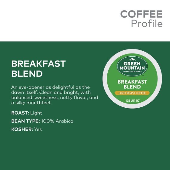 Details Ingredients Arabica Coffee Product features The mountains are a special place. It's where Green Mountain Coffee Roasters was born. It's where we developed our adventurous spirit and commitment to improving the lands through sustainably sourced coffee. We're driven to bring the world a richer, better cup of coffee. Be bold. Be alive. Grab a cup and get out there. An eye-opener as delightful as the dawn itself. Clean and bright, with balanced sweetness, nutty flavor, and a silky mouthfeel. Made with 100% Arabica coffee. These single-serve K-Cup pods are compatible with all Keurig K-Cup Pod Single-Serve Coffee Makers. Each K-Cup pod is filled with the freshest ground coffee and brews a perfect, great tasting cup of coffee, every time. Certified Orthodox Union Kosher. Bright, crisp blend with balanced sweetness, nutty flavor, and a clean, silky mouthfeel. Light roast, caffeinated coffee Each K-Cup pod is made with 100% Arabica ground coffee and no artificial ingredients Certified Orthodox Union Kosher (U) Special Features