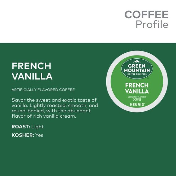 Details Ingredients ARABICA COFFEE, NATURAL AND ARTIFICIAL FLAVORS. Product features The mountains are a special place. It's where Green Mountain Coffee Roasters® was born. It's where we developed our adventurous spirit and commitment to improving the lands through sustainably sourced coffee. We're driven to bring the world a richer, better cup of coffee. Be bold. Be alive. Grab a cup and get out there.™ With Green Mountain Coffee Roasters French Vanilla you can savor the sweet and exotic taste of vanilla. Lightly roasted, smooth, and round-bodied, with the abundant flavor of rich vanilla cream. These single-serve K-Cup® pods are compatible with all Keurig K-Cup® Pod Single-Serve Coffee Makers. Each K-Cup® pod is filled with the freshest ground coffee and brews a perfect, great tasting cup of coffee, every time. Certified Orthodox Union Kosher. The lusciously rich flavor of sweet vanilla cream Light roast, caffeinated coffee Made with Arabica beans Certified Orthodox Union Kosher (U) Compatible with Keurig® K-Cup® pod single-serve coffee makers Special Features