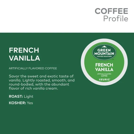 Details Ingredients ARABICA COFFEE, NATURAL AND ARTIFICIAL FLAVORS. Product features The mountains are a special place. It's where Green Mountain Coffee Roasters® was born. It's where we developed our adventurous spirit and commitment to improving the lands through sustainably sourced coffee. We're driven to bring the world a richer, better cup of coffee. Be bold. Be alive. Grab a cup and get out there.™ With Green Mountain Coffee Roasters French Vanilla you can savor the sweet and exotic taste of vanilla. Lightly roasted, smooth, and round-bodied, with the abundant flavor of rich vanilla cream. These single-serve K-Cup® pods are compatible with all Keurig K-Cup® Pod Single-Serve Coffee Makers. Each K-Cup® pod is filled with the freshest ground coffee and brews a perfect, great tasting cup of coffee, every time. Certified Orthodox Union Kosher. The lusciously rich flavor of sweet vanilla cream Light roast, caffeinated coffee Made with Arabica beans Certified Orthodox Union Kosher (U) Compatible with Keurig® K-Cup® pod single-serve coffee makers Special Features