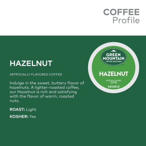 Details Ingredients Arabica Coffee, Natural and Artificial Flavors. Product features The mountains are a special place. It's where Green Mountain Coffee Roasters was born. It's where we developed our adventurous spirit and commitment to improving the lands through sustainably sourced coffee. We're driven to bring the world a richer, better cup of coffee. Be bold. Be alive. Grab a cup and get out there. Indulge in the sweet, buttery flavor of hazelnuts. A lighter-roasted coffee, our Hazelnut is rich and satisfying with the flavor of warm, roasted nuts. These single-serve K-Cup pods are compatible with all Keurig K-Cup Pod Single-Serve Coffee Makers. Each K-Cup pod is filled with the freshest ground coffee and brews a perfect, great tasting cup of coffee, every time. Certified Orthodox Union Kosher. NEW look, same great taste! The buttery, sweet flavor of roasted nuts Light roast, caffeinated coffee Made with Arabica beans Certified Orthodox Union Kosher (U) Ensure high-quality coffee every time with pods specially designed to work in Keurig brewers Special Features Artificially flavored. Keurig brewed. K-Cup Packs. For Keurig K-Cup Brewing Systems. Not for Keurig Vue Brewing Systems. The Green Mountain Coffee Story: A great tasting cup of coffee can give you a whole new perspective. It's a moment to pause, reflect, and reprioritize. That moment is what inspires us to make coffee that benefits everyone it touches. From carefully sourcing and roasting the highest quality beans, to supporting small farms and protecting the environment, we focus on what's important. That's why we believe a good cup of coffee can change your day - but a great cup of coffee can help change the world. www.GreenMountainCoffee.com. Facebook.com/GreenMountainCoffee. Brewing a better world - together. BrewingABetterWorld.com. Your Perfect Cup: Keurig Brewed is our promise. Since the beginning, we've been dedicated to the art and science of bringing you the coffee you love, every time. Always look for the Keurig Brewed seal. The only mark of genuine Keurig quality. Indulge in a little buttery nuttiness: A lighter-roasted coffee, our hazelnut is buttery and sweet with the satisfying flavor of warm, roasted nuts. One whiff of its nutty-sweet aroma and you'll fondly remember autumn evenings in Italy. Even if you've never been. Made with arabica coffee (100%). For more information contact: Green Mountain Coffee Roasters, Inc., 1-888-879-4627; www.GreenMountainCoffee.com. For brewer inquiries contact: 1-866-901-BREW/1-866-901-2739; www.Keurig.com. Find us on Facebook.com/Keurig or Twitter.com/Keurig. This package is made with a minimum of 35% post-consumer materials. Printed in the USA.