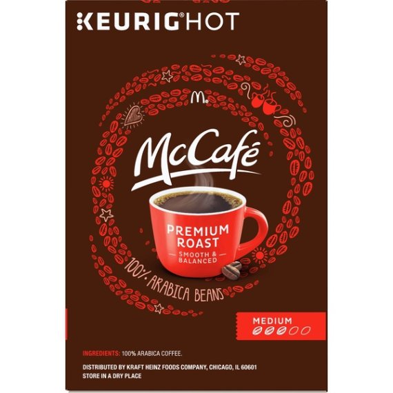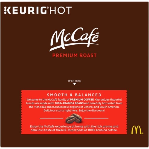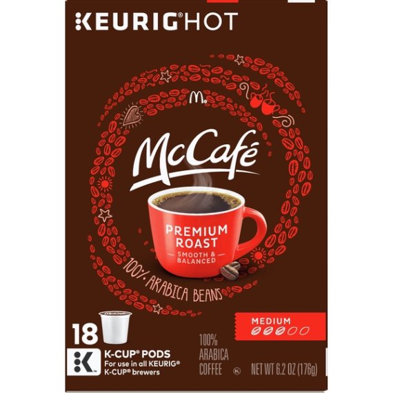 Details Ingredients Ingredients: 100% Arabica Coffee. Product features McCafe Premium Roast Medium Coffee K-Cup Pods let you enjoy the McCafe experience at home or at work. Delivering a smooth and balanced flavor, this delicious medium roast coffee is perfect for sipping throughout the day. This 100% Arabica coffee is carefully harvested from the rich soils and mountainous regions of Central and South America. Brew a cup of McCafe premium roast coffee in all Keurig 1.0 & 2.0 brewing systems. This 6.2 ounce box of K Cups includes 18 individually sealed pods for single-serve brewing. Try McCafe and experience the McDonalds coffee experience and taste in the comfort of your own home. One box of 18 McCafe Premium Roast Medium Coffee K-Cup Pods McCafe Premium Roast Medium Coffee K-Cup Pods let you enjoy the McCafe experience at home or at work Medium roast coffee delivers a smooth, balanced flavor 100% Arabica bean coffee Brew a cup of McCafe premium roast coffee in all Keurig 1.0 & 2.0 brewing systems Sealed Keurig K-Cup Pods Certified Kosher coffee Special Features New! Smooth & balanced. 100% arabica beans. Keurig Brewed. For Keurig K-Cup brewing systems. Not for Keurig Vue brewing systems. For use in all Keurig K-Cup brewers. Your perfect cup. Keurig Brewed is our promise. Since the beginning, we've been dedicated to the art and science of bringing you the coffee you love, every time. Always look for the Keurig Brewed seal. Welcome to the McCafe family of premium coffee. Our unique flavorful blends are made with 100% arabica beans and carefully harvested from the rich soils and mountainous regions of Central and South America. Delicious starts right here. Enjoy the discovery! Enjoy the McCafe experience at home with the rich aroma and delicious taste of these K-Cup packs of 100% arabica coffee. Keurig Brewed: The only mark of genuine Keurig quality. Not for Vue brewing systems. For more information contact: 1-855-572-3802 or visit us at: www.mcdonalds.com/mccafeathome. For brewing inquiries contact: 1-866-901-BREW/1-866-901-2739. www.Keurig.com. Find us on Facebook.com/Keurig or Twitter.com/Keurig. Please recycle this carton. Printed in Canada.
