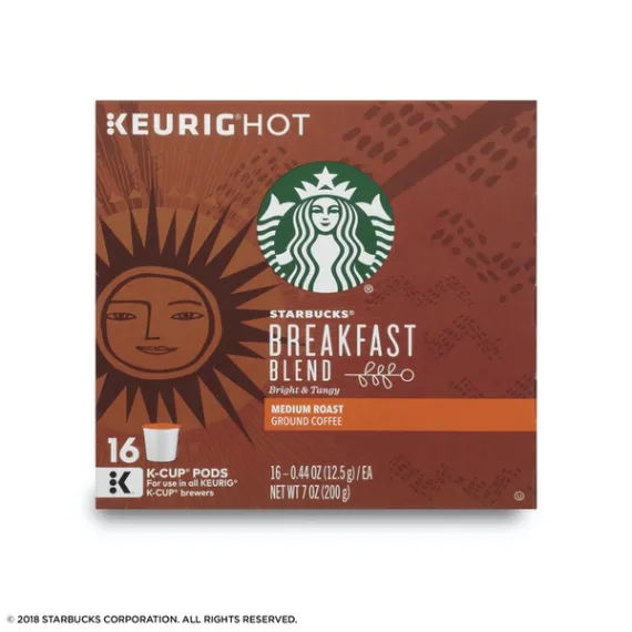 Details Ingredients 100% Arabica Coffee. Product features It's an ode to sunrise. This lighter-bodied and milder coffee features bright citrus notes that dance across your tongue, awaken your taste buds and then wash away clean. A wonderful first cup of the day. Keurig, Keurig Hot, K-Cup and the K logo are trademarks of Keurig Green Mountain, Inc., used with permission. Starbucks Breakfast Blend is a medium-roasted blend of coffees with bright citrus notes Medium-roasted coffees are smooth and balanced with rich, approachable flavors Designed for use with the Keurig Single Cup Brewing System Enjoy the Starbucks coffee you love without leaving the house Includes one box of 16 servings for a total of 16 individual K-Cup pods Special Features Crisp & tangy. Keurig Brewed. Starbucks Coffee, in Single-Cup Servings: We've roasted and ground our high-quality arabica beans and packaged them for easy single-cup brewing. It's the coffee you love from Starbucks, now designed for making a perfect cup in less than a minute. Our Roast System: Each coffee requires a unique roast profile to create a cup at its peak of aroma, acidity, body and flavor. We classify our coffees in three distinctive roast profiles so you can easily find the flavor and intensity you're looking for. Medium: Medium-roasted coffees are balanced with smooth and rich flavors. Packed in K-Cup portion packs for use in Keurig Brewers. It's an ode to sunrise. This lighter-bodied and milder coffee features bright citrus notes that dance across your tongue, awaken your taste buds and then wash away clean. A wonderful first cup of the day. Always 100% arabica coffee. To learn more, visit us at Starbucks.com/K-Cup. 100% recycles paperboard, minimum 35% post-consumer material. Printed in Canada.