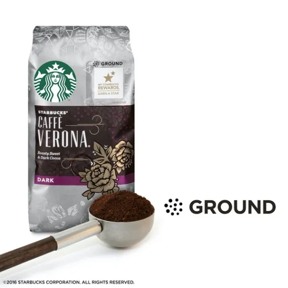 Details Ingredients 100% Arabica Coffee. Product features This is a coffee of one true love, and three names. We created it just for a Seattle restaurant in 1975, naming it Jakes Blend. And people loved it. So many, in fact, that we began hand scooping and blending it to order in our stores, where it was known as 80/20 Blend, for the recipe. The love was so strong we finally made it official, calling it Verona after the city that inspires so many. By any name, this is a thing of pure romance. Caffe Verona is well-balanced and rich coffee with a dark cocoa texture Darker-roasted coffees have fuller body with robust, bold taste Enjoy the Starbucks coffee you love without leaving the house For finest taste, use cold, filtered water and store ground coffee in a cool, dark place Each pack includes one 12-ounce bag of ground Starbucks coffee Special Features Roasty sweet & dark cocoa. Conservation International. Proud partners in ethical coffee sourcing since 1998. Find out more at starbucks.com/responsibility or conservation.org. The Starbucks Roast: Each coffee requires a slightly different roast to reach its peak of aroma, acidity, body and flavor. We classify our coffees in three roast piles, so finding your favorite is easy. Dark: Full-bodied & bold. The Story of Caffe Verona: This is a coffee of one true love, and three names. We created it just for a Seattle restaurant in 1975, naming it Jake's Blend. And people loved it. So many, in fact, that we began hand scooping and blending it to order in our stores, where it was known as 80/20 blend, for the recipe. The love was so strong we finally made it official, calling it Verona after the city that inspires so many. By any name, this is a thing of pure romance. Starbucks FlavorLock packaging guarantees the fresh flavor of our coffees. Visit us at Starbucks.com/coffee or call 1-800-Starbucks.
