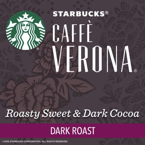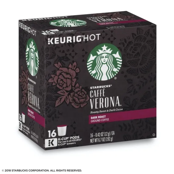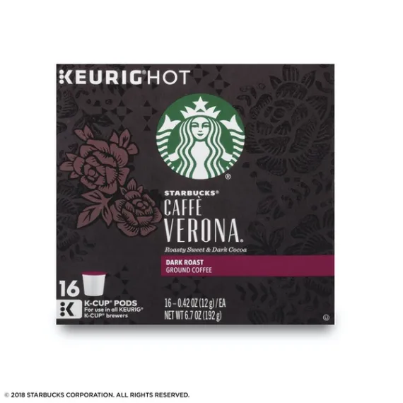 Details Ingredients 100% ARABICA COFFEE. Product features This is a coffee of one true love and three names. We created it expressly for a Seattle restaurant in 1975, naming it Jake's Blend. And people loved it. So many, in fact, that we began hand scooping and blending it to order in our stores, where it was known as 80/20 Blend. The love was so strong that we finally made it official, calling it Verona after the city that inspires so many. By any name, this is a thing of pure romance. Keurig, Keurig Hot, K-Cup and the K logo are trademarks of Keurig Green Mountain, Inc., used with permission. Starbucks Caffe Verona coffee is well-balanced and rich with a dark cocoa texture Darker-roasted coffees have fuller body with robust, bold taste Starbucks K-Cup pods are designed for use with the Keurig Single Cup Brewing System Enjoy the Starbucks coffee you love without leaving your home or office Includes one box of 16 servings for a total of 16 individual K-Cup pods Special Features Dark cocoa & roasty sweet. Keurig brewed. Starbucks Coffee, in Single-Cup Servings: We've roasted and ground our high-quality arabica beans and packaged them for easy single-cup brewing. It's the coffee you love from Starbucks, now designed for making a perfect cup in less than a minute. Our Roast System: Each coffee requires a unique roast profile to create a cup at its peak of aroma, acidity, body and flavor. We classify our coffees in three distinctive roast profiles so you can easily find the flavor and intensity you're looking for. Dark: Darker-roasted coffees feature a fuller body and robust, bold flavors. Packed in K-Cup portion packs for use in Keurig brewers. A passion for the culinary romance of Italy inspired this full-bodied blend of Latin American and Asia/Pacific coffees, with Italian Roast (a dark roast blend) added for depth. It's rich and well-balanced with a dark cocoa texture and a roasty sweetness. Always 100% arabica coffee. To learn more, visit us at Starbucks.com/K-Cup. 100% recycled paperboard, minimum 35% post-consumer material. Printed in Canada.