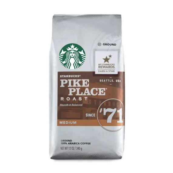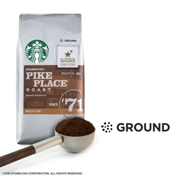 Details Ingredients Arabica Coffee (100%). Product features In 1971 we opened our first store in Seattle's Pike Place Market. Reflecting on our heritage inspired us to create this delicious blend with smooth body and subtle flavors of cocoa and toasted nuts. Brewed fresh every day in our stores, it's a rich, satisfying and balanced cup. Pike Place is a registered trademark of The Pike Place Market PDA, used under license. Pike Place Roast is well-rounded with subtle notes of cocoa and toasted nuts balancing the smooth mouthfeel Medium-roasted coffees are smooth and balanced with rich, approachable flavors Enjoy Starbucks at home. The coffee you love without leaving the house For finest taste, use cold, filtered water and store ground coffee in a cool, dark place Each pack includes one 12-ounce bag of ground Starbucks coffee Special Features Since '71. Smooth & balanced. Conservation International: Proud partners in ethical coffee sourcing since 1998. Find out more at starbucks.com/responsibility or conservation.org. The Starbucks Roast: Each coffee requires a slightly different roast to reach its peak of aroma, acidity, body and flavor. We classify our coffees in three roast profiles, so finding your favorite is easy. Medium: Balanced, smooth & rich. The Story of Pike Place Roast: From our first store in Seattle's Pike Place Marketto our coffeehouses around the world, customers requested a freshly brewed coffee they could enjoy throughout the day. So in 2008 our master blenders and roasters created it for you, a blend so consistent and harmonious that no single characteristic dominates - or disappears. A smooth, well-rounded blend of Latin American coffees with subtly rich flavors of cocoa and toasted nuts, it's served fresh every day at a Starbucks near you. Starbucks FlavorLock packaging guarantees the fresh flavor of our coffees. Visit us at starbucks.com/coffee or call 1-800-STARBUCKS.