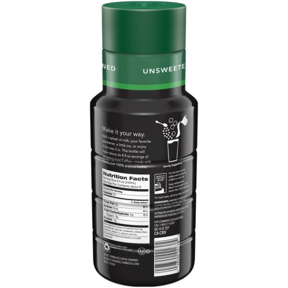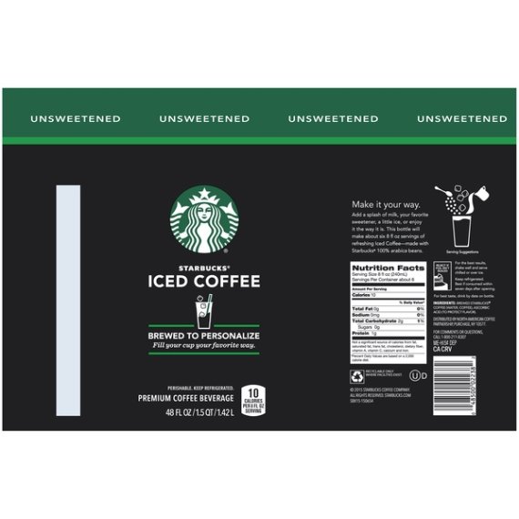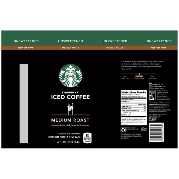 Details Ingredients BREWED STARBUCKS COFFEE (WATER, COFFEE). Product features Brewed to personalize. Fill your cup your favorite way. Enjoy the Starbucks coffee you lovein the comfort of your home with Starbucks Iced Coffee Iced Espresso Classics. Starbucks Unsweetened Medium Roast Iced Coffee, 48 oz: Starbucks coffee in the comfort of your home Medium roast with smooth, balanced flavor profile 48 oz of unsweetened iced coffee per bottle Net Quantity of Content 4 X 12 fl oz