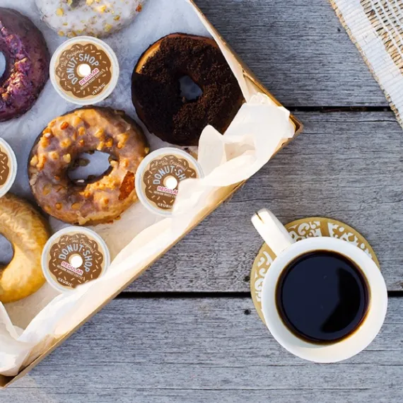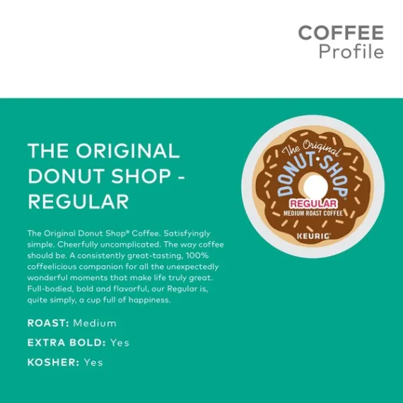 Details Ingredients COFFEE Product features Before coffee was complicated, great coffee was simply fresh, bold, and flavorful. The Original Donut Shop Regular single serve K-Cup pods bring back the classic donut companion, with this ideally balanced brew of the highest quality beans...dunking is encouraged. Full-flavored and easy going, this medium roast blend embodies one of the best things in life - simply great coffee. These single-serve K-Cup pods are compatible with all Keurig K-Cup Pod Single-Serve Coffee Makers and brew up to 12 oz. of The Original Donut Shop Regular coffee each. Each K-Cup pod is filled with the freshest ground coffee and brews a perfect, great tasting cup of coffee, every time. Certified Orthodox Union Kosher and contains no artificial ingredients. Not too harsh, not too bitter - just right Extra bold (contains more coffee than regular K-Cup pods) Medium roast, caffeinated coffee Ensure high-quality coffee every time with pods specially designed to work in Keurig brewers with exact grind and extraction Orthodox Union Kosher Special Features
