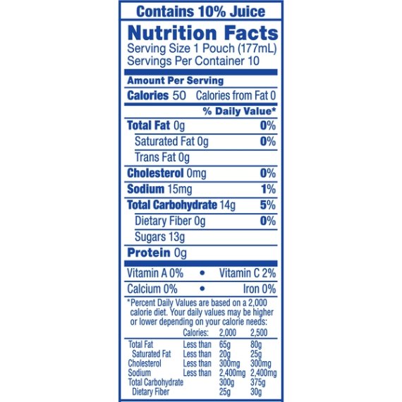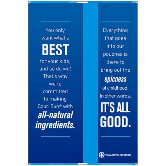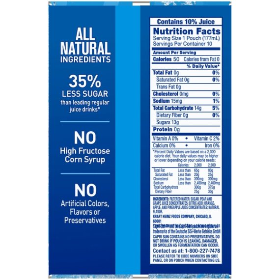 Details Ingredients Fruit Punch Ingredients: Filtered Water; Sugar; Pear And Grape Juice Concentrates; Citric Acid; Orange, Apple, And Pineapple Juice Concentrates; Natural Flavor. Show more Product features Capri Sun Fruit Punch Flavored Juice Drink Blend offers an all natural drink option conveniently packaged for portability. Each pouch of ready to drink fruit punch for kids captures the sweet, juicy flavor of oranges, pineapples, apples, and other fruits in a kid-friendly drink. These kids fruit punch drink pouches contain no artificial colors, flavors, preservatives or high fructose corn syrup. Thats what makes Capri Sun as epic as the kids who drink it. Each fruit punch single serve pouch contains 35% less sugar than leading regular juice drinks (this product 13 grams of sugars; leading regular juice drinks 22 grams of sugars per 6 fluid ounce serving). This thirst-quenching drink for kids comes in individual pouches with attached straws for convenience. The 10 count box of fruit punch pouches doubles as an easy-open fridge pack to keep things organized. One 10 ct. box of Capri Sun Fruit Punch Flavored Juice Drink Blend Capri Sun Fruit Punch Juice Drink Blend delivers fun refreshment with all natural ingredients Ready to drink beverage offers a convenient way to hydrate Intense fruit punch taste from natural flavors appeals to kids Contains no high fructose corn syrup and no artificial colors, flavors or preservatives Contains 35% less sugar than leading regular juice drinks Packed in individual pouches with straws for portability Special Features Low Sugar Net Quantity of Content 10.0 X 1 pouch (177 mL)
