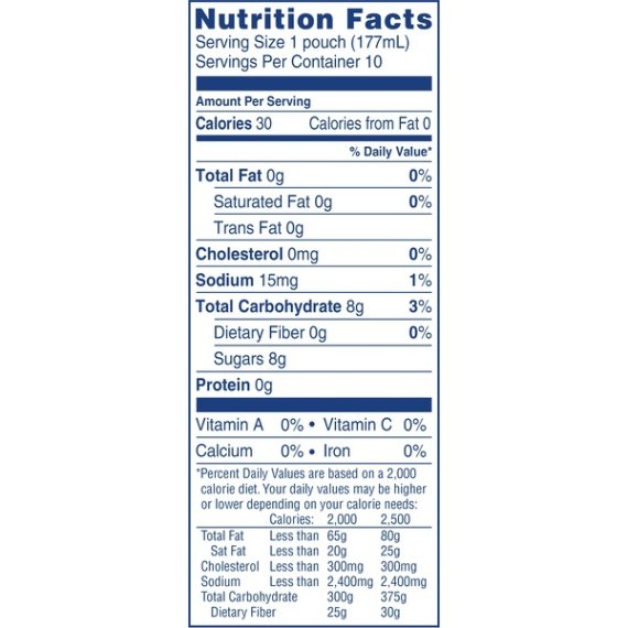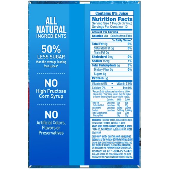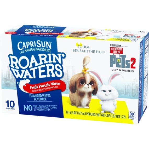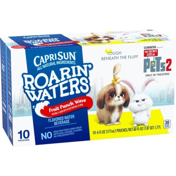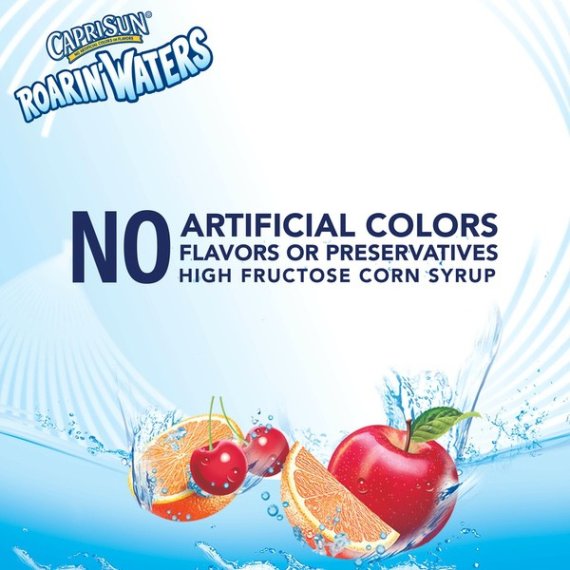 Details Ingredients Ingredients: Filtered Water, Sugar, Citric Acid, Stevia Leaf Extract, Natural Flavor. Product features Capri Sun Roarin' Waters Fruit Punch Wave Flavored Water makes hydration easy and flavorful with a refreshing ready to drink beverage you can take anywhere. Natural fruit punch flavor adds a fruity touch to thirst-quenching water with a familiar taste kids enjoy. This kids fruit punch flavored water is made without artificial colors, preservatives or flavors, so you can feel good about serving it to your family. It's naturally sweetened with stevia leaf extract and real sugar and contains 50% less sugar than the average leading fruit juices (per 6 ounces, this product has 8 grams of sugar; fruit juices 20 grams of sugar). The clear bottom pouch design lets you see the goodness inside and makes it easy to take this fruit punch for kids drink along on all your adventures. Slide the 10 count easy-open box of fruit punch pouches into your refrigerator, so you're always ready for flavorful hydration. One 10 ct. box of Capri Sun Roarin' Waters Fruit Punch Wave Flavored Water Capri Sun Roarin' Waters Fruit Punch Flavored Water delivers hydration with a lightly flavored water Ready to drink fruit punch drink requires no prep Naturally flavored fruit punch drink offers a refreshing, familiar taste Contains 50% less sugar than the average leading fruit juices Naturally sweetened with stevia leaf extract and sugar and contains no high fructose corn syrup Made without artificial flavors, colors or preservatives Net Quantity of Content 10.0 X 1 pouch (177mL)