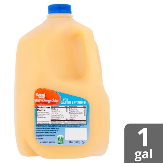 Details Ingredients FILTER WATER, ORGANIC JUICE CONCENTRATE, TRICALCIUM PHOSPHATE*, CALCIUM LACTATE*, VITAMIN D3*. Product features Start your day off right with a glass of Great Value 100% Orange Juice. Enjoy the refreshing taste of freshly-picked oranges while refueling your body with vitamin C, vitamin D, and other healthy nutrients like vitamin A, vitamin B6, calcium, iron, and magnesium. Rest assured this juice is 100% pure and pasteurized, so you can enjoy every sip, every time you're craving some OJ. Great Value 100% Orange Juice has only 120 calories per serving, is made with natural ingredients, and contains no high fructose corn syrup, making it an excellent beverage of choice for the health-conscious consumer. This juice combines superior taste and quality ingredients in a convenient gallon jug so you can enjoy an incredible value at a great price. Treat yourself to the delicious taste of Great Value 100% Orange Juice. Great Value products provide families with affordable, high quality grocery and household consumable options. With our wide range of product categories spanning grocery and household consumables, we offer you a variety of products for your family's needs. Our products are conveniently available online and in Walmart stores nationwide, allowing you to stock up and save money at the same time. 120% vitamin C daily value per serving With calcium and vitamin D Net weight 1 gallon Orange juice from concentrate Contains 100% orange juice 120 calories per serving 0g total fat and cholesterol Chill and shake well before serving Pasteurized Special Features Calcium and vitamin d Net Quantity of Content 16 X 8 fl oz