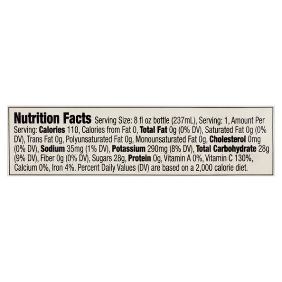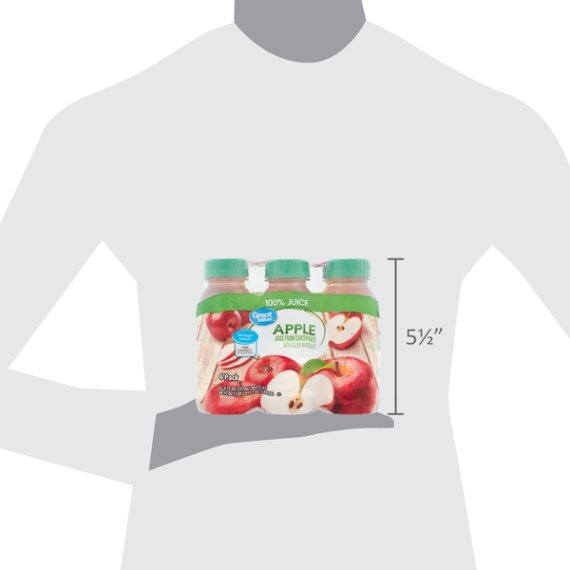 Details Ingredients Apple Juice from Concentrate (Water, Apple Juice Concentrate), Ascorbic Acid (Vitamin C) Product features Apple Juice form Concentrate with Added IngredientNo sugar added**Not a low calorie food.Great Value Apple 100% Juice is a delicious beverage that delivers a burst of refreshing, crisp apple flavor that you will enjoy with every sip. This juice has no added sugars and also offers a nutritional boost as it delivers 130% of the daily recommended value of vitamin C in each serving, making it great for your health. Great Value Apple 100% Juice is a great beverage option for any health-conscious individual as our juice is made with natural ingredients, no added sugar, and only has 110 calories per serving. The 8-fluid ounce bottles are ideal for lunches or a family on the go. This juice combines great taste and quality ingredients so you can enjoy an incredible value at a great price. Treat yourself to the great taste of Great Value Apple 100% Juice.Great Value products provide families with affordable, high quality grocery and household consumable options. With our wide range of product categories spanning grocery and household consumables, we offer you a variety of products for your family's needs. Our products are conveniently available online and in Walmart stores nationwide, allowing you to stock up and save money at the same time. 130% vitamin C daily value per serving(6) 8fl oz bottlesApple juice from concentrateNo sugar addedContains 100% juice110 calories per serving0g total fatChill and shake well before servingPasteurizedGluten-free Net Quantity of Content 6 X 8 fl oz (237mL)