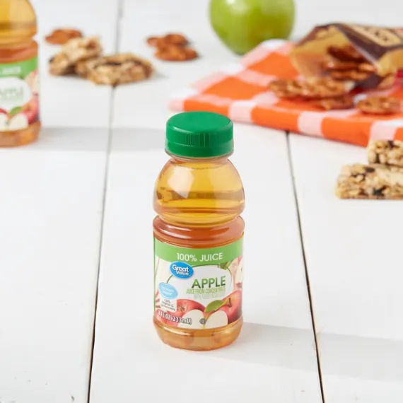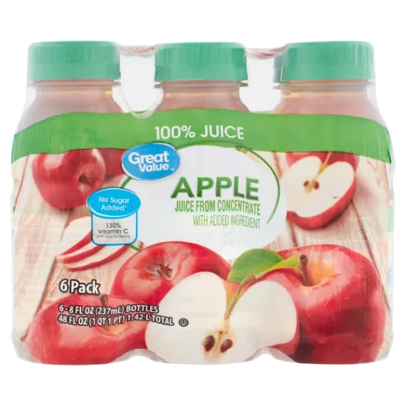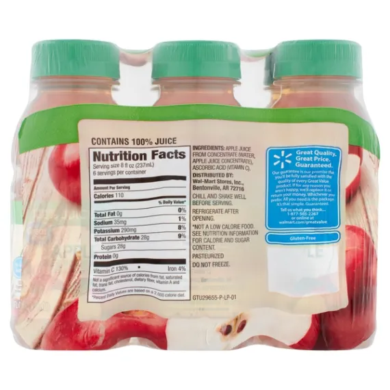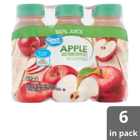 Details Ingredients Apple Juice from Concentrate (Water, Apple Juice Concentrate), Ascorbic Acid (Vitamin C) Product features Apple Juice form Concentrate with Added IngredientNo sugar added**Not a low calorie food.Great Value Apple 100% Juice is a delicious beverage that delivers a burst of refreshing, crisp apple flavor that you will enjoy with every sip. This juice has no added sugars and also offers a nutritional boost as it delivers 130% of the daily recommended value of vitamin C in each serving, making it great for your health. Great Value Apple 100% Juice is a great beverage option for any health-conscious individual as our juice is made with natural ingredients, no added sugar, and only has 110 calories per serving. The 8-fluid ounce bottles are ideal for lunches or a family on the go. This juice combines great taste and quality ingredients so you can enjoy an incredible value at a great price. Treat yourself to the great taste of Great Value Apple 100% Juice.Great Value products provide families with affordable, high quality grocery and household consumable options. With our wide range of product categories spanning grocery and household consumables, we offer you a variety of products for your family's needs. Our products are conveniently available online and in Walmart stores nationwide, allowing you to stock up and save money at the same time. 130% vitamin C daily value per serving(6) 8fl oz bottlesApple juice from concentrateNo sugar addedContains 100% juice110 calories per serving0g total fatChill and shake well before servingPasteurizedGluten-free Net Quantity of Content 6 X 8 fl oz (237mL)