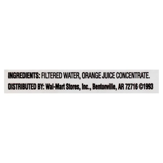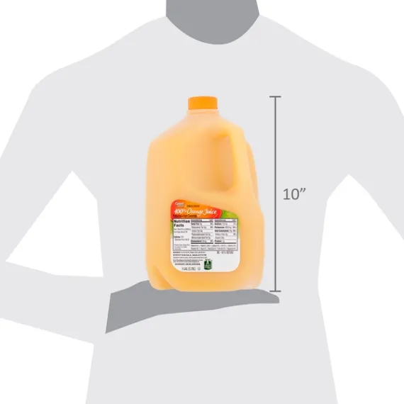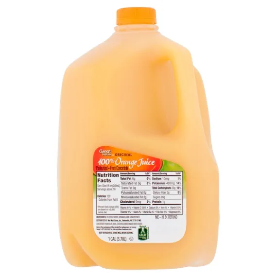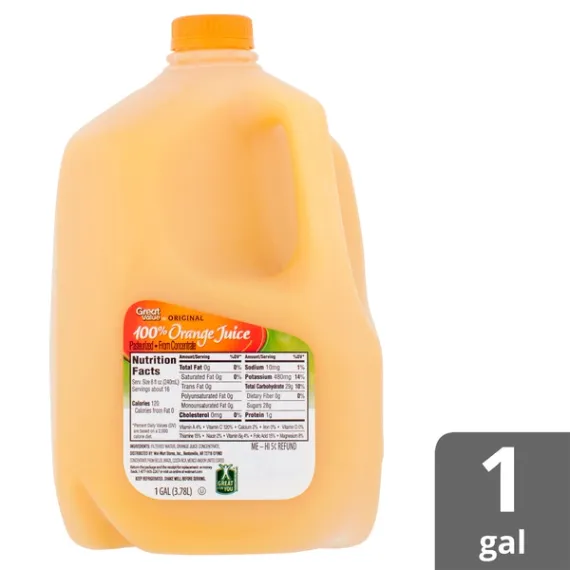 Details Ingredients FILTERED WATER, ORANGE JUICE CONCENTRATE. Product features Start your day off right with a glass of Great Value Original 100% Orange Juice. Enjoy the refreshing taste of fresh oranges while refueling your body with nutritious vitamin A, vitamin C, and other healthy nutrients like calcium and magnesium. Rest assured this juice is 100% pure and pasteurized, so you can enjoy every sip every time you're craving some OJ. Great Value Original 100% Orange Juice has only 120 calories per serving, is made with natural ingredients, and contains no high fructose corn syrup, making it an excellent beverage of choice for the health-conscious consumer. This juice combines excellent taste and quality ingredients in a convenient gallon jug so you can enjoy an incredible value at a great price. Treat yourself to the great taste of Great Value Original 100% Orange Juice. Great Value products provide families with affordable, high quality grocery and household consumable options. With our wide range of product categories spanning grocery and household consumables, we offer you a variety of products for your family's needs. Our products are conveniently available online and in Walmart stores nationwide, allowing you to stock up and save money at the same time. 120% daily value of vitamin C per serving Net weight 1 gallon Orange juice from concentrate Contains 100% orange juice 120 calories per serving 0g total fat No cholesterol Chill and shake well before serving Pasteurized Special Features No artificial colors or flavors Net Quantity of Content 16.0 X 8 fl oz
