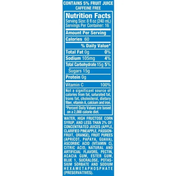 Details Ingredients WATER, HIGH FRUCTOSE CORN SYRUP AND CONTAINS 2% OR LESS OF: CONCENTRATED JUICES (APPLE, CLARIFIED PINEAPPLE, PASSIONFRUIT, ORANGE), FRUIT PUREES (APRICOT, PAPAYA, GUAVA), ASCORBIC ACID (VITAMIN C), CITRIC ACID, NATURAL AND ARTIFICIAL FLAVORS, PECTIN, ACACIA GUM, ESTER GUM, BLUE 1, SUCRALOSE, POTASSIUM SORBATE AND SODIUM HEXAMETAPHOSPHATE (PRESERVATIVES) Show more Product features When it comes to fruit juice drinks, Hawaiian Punch is The Big Kahuna. Bursting with the bold taste of natural fruit juices blended with mixed berry flavors, Hawaiian Punch Berry Blue Typhoon is a delicious and unique taste that kids and the entire family will enjoy. This family-sized one gallon container is the perfect drink for dinner time or anytime. Berry Blue Typhoon is both caffeine and carbonation free and provides 100% of the daily value of vitamin C. Treat your family to the delicious taste of Hawaiian Punch. Made with natural fruit juicesCaffeine and carbonation free100% daily value of vitamin COne 1 gallon bottle Special Features 100% dv of vitamin c Net Quantity of Content 16 X 8 fl oz