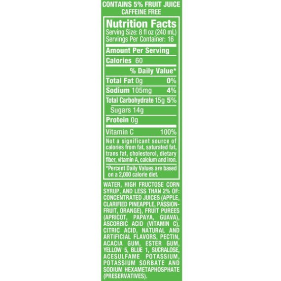 Details Ingredients WATER, HIGH FRUCTOSE CORN SYRUP AND CONTAINS 2% OR LESS OF: CONCENTRATED JUICES (APPLE, CLARIFIED PINEAPPLE, PASSIONFRUIT, ORANGE), FRUIT PUREES (APRICOT, PAPAYA, GUAVA), ASCORBIC ACID (VITAMIN C), CITRIC ACID, NATURAL AND ARTIFICIAL FLAVORS, PECTIN, ACACIA GUM, ESTER GUM, YELLOW 5, BLUE 1, SUCRALOSE, ACESULFAME POTASSIUM, POTASSIUM SORBATE AND SODIUM HEXAMETAPHOSPHATE (PRESERVATIVE) Show more Product features When it comes to fruit juice drinks, Hawaiian Punch is The Big Kahuna. Bursting with the bold taste of natural fruit juices and mixed with exotic kiwi and strawberry flavors, Hawaiian Punch Green Berry Rush is a delicious and unique taste that kids and the entire family will enjoy. This family-sized one gallon container is the perfect drink for dinner time or anytime. Green Berry Rush is both caffeine and carbonation free and provides 100% of the daily value of vitamin C. Treat your family to the delicious taste of Hawaiian Punch. Made with natural fruit juicesCaffeine and carbonation free100% daily value of vitamin COne 1 gallon bottle Special Features 100% vitamin c per serving Net Quantity of Content 16 X 8 fl oz