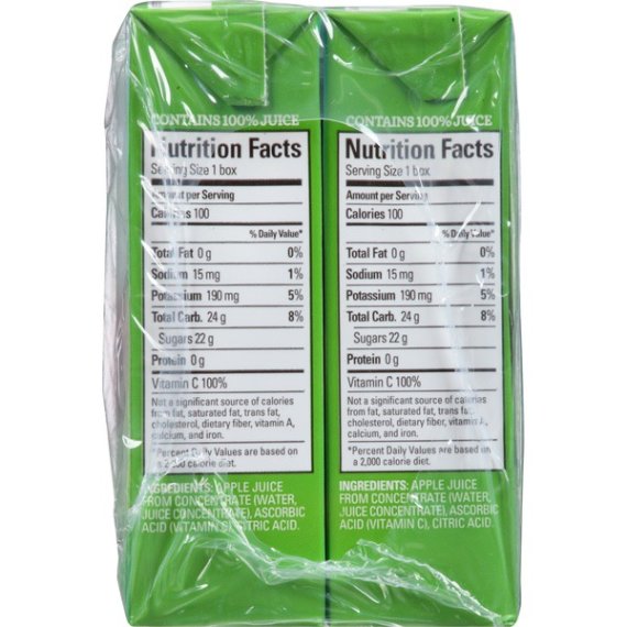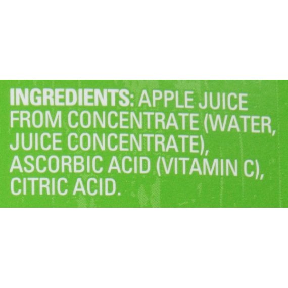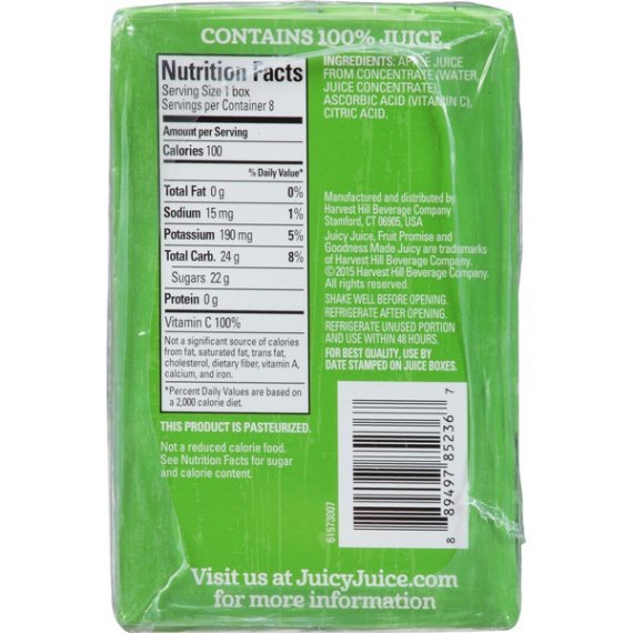 Details Ingredients APPLE JUICE FROM CONCENTRATE (WATER, JUICE CONCENTRATE), ASCORBIC ACID (VITAMIN C), CITRIC ACID. Product features Boost your day with some Juicy Juice apple Juice. Each serving gives you more than a full day's worth of vitamin C. This no-added-sugar juice, 8-count contains no preservatives and no high-fructose corn syrup. It is 100-percent natural so you can sip this drink guilt-free. Enjoy this fruit drink at home, work, school or while on the go.Juicy Juice Apple 100% Juice: Goodness made juicy100% vitamin C daily value per servingNo added sugar fruit juiceNo high-fructose corn syrupNo artificial sweetenersNo artificial flavors