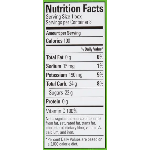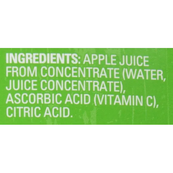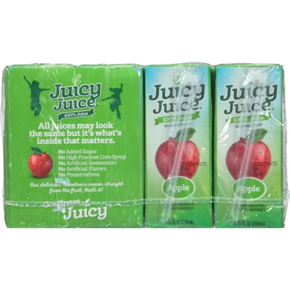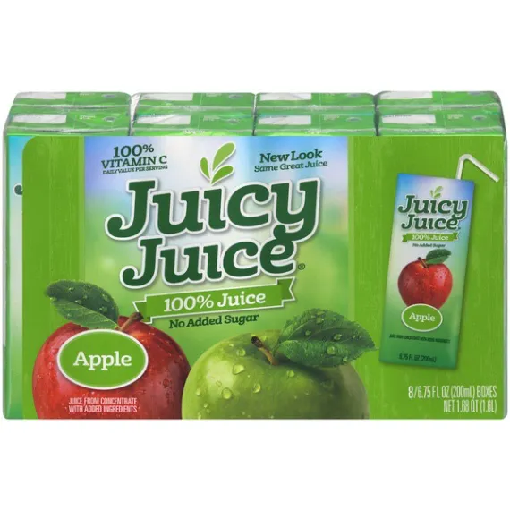 Details Ingredients APPLE JUICE FROM CONCENTRATE (WATER, JUICE CONCENTRATE), ASCORBIC ACID (VITAMIN C), CITRIC ACID. Product features Boost your day with some Juicy Juice apple Juice. Each serving gives you more than a full day's worth of vitamin C. This no-added-sugar juice, 8-count contains no preservatives and no high-fructose corn syrup. It is 100-percent natural so you can sip this drink guilt-free. Enjoy this fruit drink at home, work, school or while on the go.Juicy Juice Apple 100% Juice: Goodness made juicy100% vitamin C daily value per servingNo added sugar fruit juiceNo high-fructose corn syrupNo artificial sweetenersNo artificial flavors