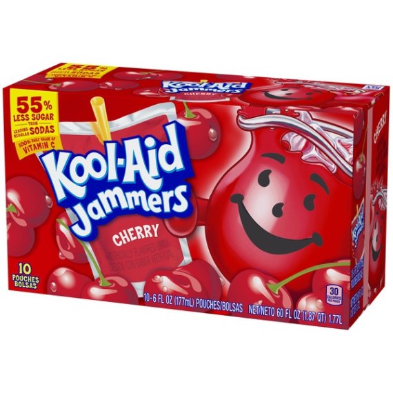 Details Ingredients Ingredients: Filtered Water, High Fructose Corn Syrup, Contains Less Than 2% Of Citric Acid, Ascorbic Acid (Vitamin C), Natural And Artificial Flavor, Sucralose (Sweetener), Red 40, Calcium Disodium Edta (Preserves Freshness). Show more Product features Kool Aid Jammers Cherry Flavored Drink is gushing with juicy cherry flavor. This cherry drink is an excellent source of Vitamin C, and is an excellent way to treat your family to some delicious fun. These red cherry drink pouches are packaged in a convenient easy-open fridge pack that helps keep your refrigerator neat and organized. Each 60 fluid ounce case of cherry fruit drink contains ten 6 fluid ounce pouches. Store this box of fruit drink pouches in the refrigerator for a refreshing cherry drink on the go. There are so many ways to enjoy Kool Aid. Flavorful fun made easy - available in a rainbow of flavors! Ten 6 fl. oz. pouches of Kool Aid Jammers Cherry Flavored Drink Kool Aid Jammers Cherry Flavored Drink serves up the delicious taste of Kool Aid in a fun pouch A cherry drink pouch perfect for on the go convenience Excellent source of Vitamin C Convenient easy open fridge pack keeps your refrigerator tidy This box of cherry drink contains 10 pouches Store in the refrigerator for a refreshing cherry drink on the go Special Features Artificially flavored Net Quantity of Content 10.0 X 1 pouch (177 mL)