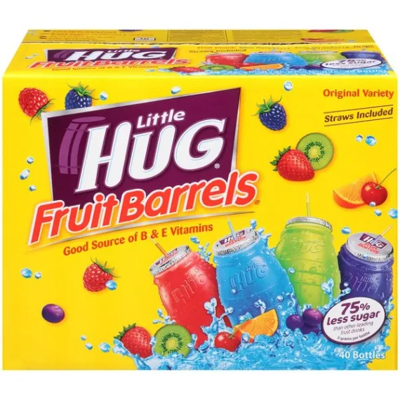 Details Ingredients Water, High Fructose Corn Syrup, Citric Acid, Sodium Polyphosphates, Natural and Artificial Flavors, Sodium Benzoate and Potassium Sorbate (to Protect Flavor), Sodium Citrate, Acesulfame Potassium, Sucralose, Red 40 (Fruit Punch, Grape), Blue 1 (Grape, Blue Raspberry and Kiwi Strawberry), Vitamin E Acetate, Niacin, Pantothenic Acid, Vitamin B6, Vitamin B12, Biotin. Show more Product features 33% more fruit drink than leading pouch drinks. Little Hug Fruit Barrels Original Variety Fruit Drinks:33% more fruit drink than leading pouch drinks75% less sugar than other leading fruit drinks2g of sugar per bottle10 calories per bottleGood source of vitamin E and 5 B vitaminsGluten freeFlavors include: fruit punch, blue raspberry, kiwi strawberry, and grape; straws included Net Quantity of Content 40 X 8 fl. oz. (1 Bottle)