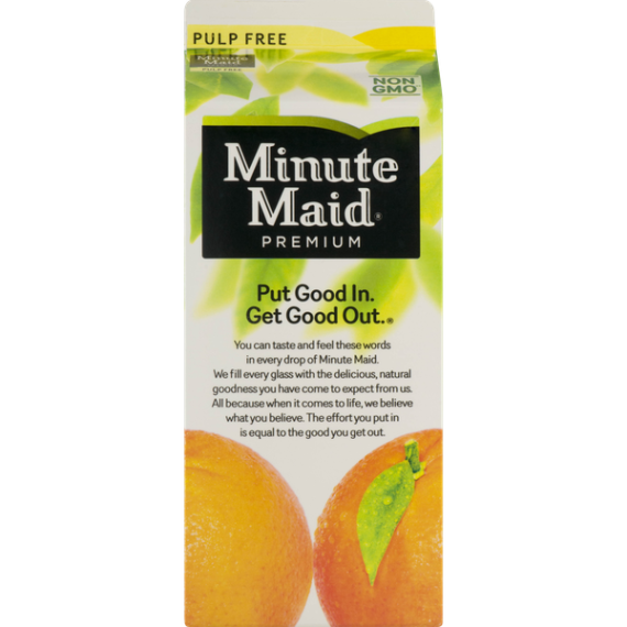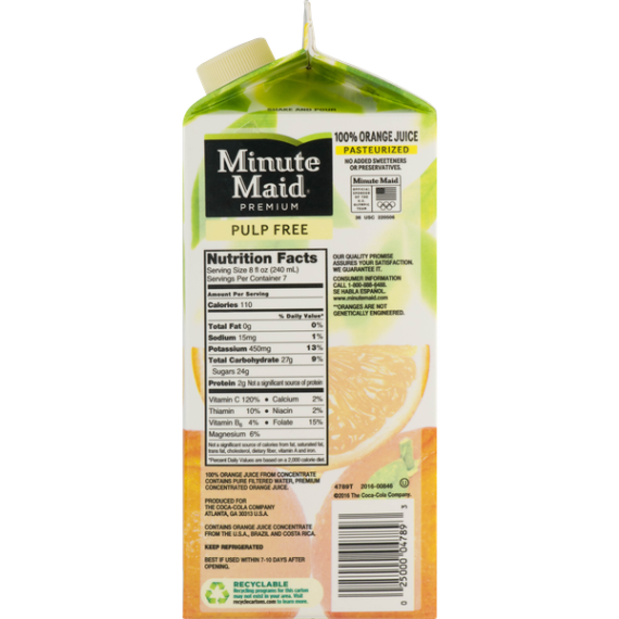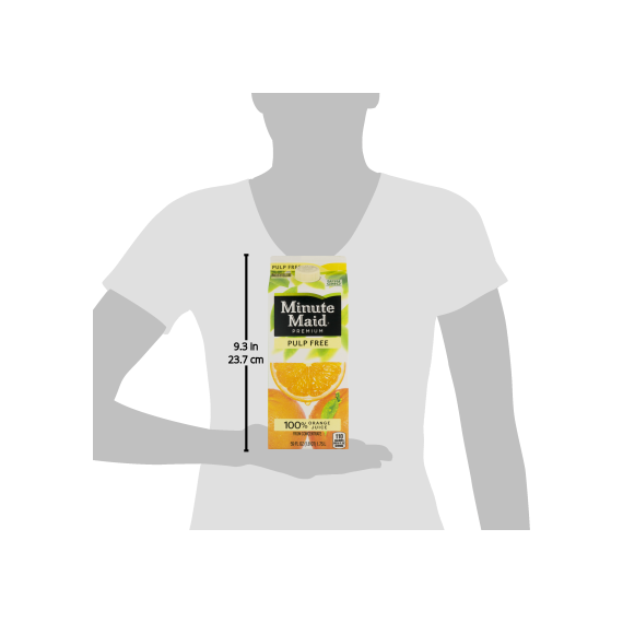 Details Ingredients 100% ORANGE JUICE FROM CONCENTRATE CONTAINS PURE FILTERED WATER, PREMIUM CONCENTRATED ORANGE JUICE. Product features Minute Maid® Premium Orange Juice Pulp Free. 100% orange juice. You can taste and feel these words in every drop of Minute Maid. We fill every glass with the delicious, natural goodness you have come to expect from us. All because when it comes to life, we believe what you believe. No added sweeteners or preservatives. Our quality promise assures your satisfaction. Minute Maid® Premium Pulp Free. 100% orange juice. From concentrate. 110 calories per 8 fl oz serving. 59 fl oz (1.8 QT) 1.75 L. Kosher Net Quantity of Content 7 X 8 fl oz
