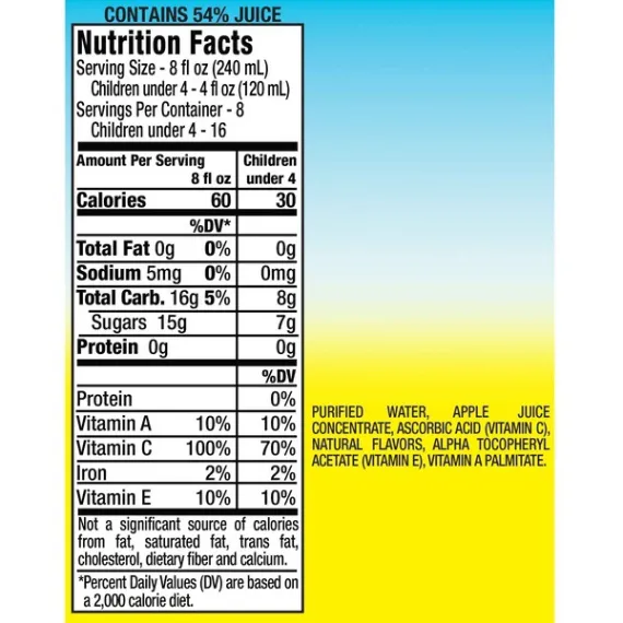Details Ingredients PURIFIED WATER, APPLE JUICE CONCENTRATE, ASCORBIC ACID (VITAMIN C), NATURAL FLAVORS, ALPHA TOCOPHERYL ACETATE (VITAMIN E), VITAMIN A PALMITATE Show more Product features Mott’s For Tots is a great tasting juice beverage made specifically for tots and is pediatrician preferred over regular juice. It combines Mott’s apple juice with purified water and 100% of the daily value of Vitamin C. There’s plenty to enjoy and share in this 64 fl oz bottle, perfect for filling your tot’s little bottles and cups. It has 40% less sugar than Mott’s 100% apple juice and contains no artificial sweeteners. Treat your little ones to the classic taste of Mott’s For Tots 40% less sugar than 100% apple juice Pediatrician preferred over regular juice 100% daily value of vitamin C One 64 fluid ounce bottle Special Features Pediatrician approved Net Quantity of Content 8 X 8 fl oz